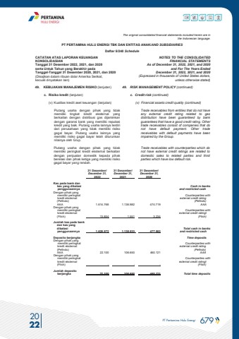 PT Pertamina Hulu Energi 679 2022The original consolidated financial statements included herein are in the Indonesian language.PT PERTAMINA HULU ENERGI TBK DAN ENTITAS ANAK/AND SUBSIDIARIES Daftar 5/240 ScheduleCATATAN ATAS LAPORAN KEUANGANKONSOLIDASIANTanggal 31 Desember 2022, 2021, dan 2020serta Untuk Tahun yang Berakhir padaTanggal-Tanggal 31 Desember 2020, 2021, dan 2020(Disajikan dalam ribuan dolar Amerika Serikat, kecuali dinyatakan lain)NOTES TO THE CONSOLIDATEDFINANCIAL STATEMENTSAs of December 31, 2022, 2021, and 2020and For The Years Ended December 31, 2022, 2021, and 2020 (Expressed in thousands of United States dollars,unless otherwise stated)49. KEBIJAKAN MANAJEMEN RISIKO (lanjutan) 49. RISK MANAGEMENT POLICY (continued)c. Risiko kredit (lanjutan) c. Credit risk (continued)(v) Kualitas kredit aset keuangan (lanjutan) (v) Financial assets credit quality (continued)Piutang usaha dengan pihak yang tidak memiliki tingkat kredit eksternal yang berkaitan dengan distribusi gas dijaminkan dengan garansi bank yang memiliki reputasi kredit yang baik. Piutang usaha lainnya terdiri dari perusahaan yang tidak memiliki risiko gagal bayar. Piutang usaha lainnya yang memiliki risiko gagal bayar telah diturunkan nilainya oleh Grup.Trade receivables from entities that do not have any external credit rating related to gas distribution have been guaranteed by bank guarantees that have a good credit rating. Other trade receivables consist of companies that do not have default payment. Other trade receivables with default payments have been impaired by the Group.Piutang usaha dengan pihak yang tidak memiliki peringkat kredit eksternal berkaitan dengan penjualan domestik kepada pihak berelasi dan pihak ketiga yang memiliki risiko gagal bayar yang rendah.Trade receivables with counterparties which do not have external credit ratings are related to domestic sales to related parties and third parties which have low default risk. 31 Desember/ 31 Desember/ 31 Desember/ December 31, December 31, December 31, 2022 2021 2020 Kas pada bank dan kas yang dibatasi Cash in bankspenggunaannya and restricted cashDengan pihak yang memiliki peringkat Counterparties withkredit eksternal external credit rating(Pefindo) (Pefindo)AAA 1.614.768 1.136.982 474.719 AAADengan pihak yang memiliki peringkat Counterparties withkredit eksternal external credit ratingt(Fitch) 13.804 1.551 3.234 (Fitch) Jumlah kas pada bank dan kas yang dibatasi Total cash in bankspenggunaannya 1.628.572 1.138.533 477.953 and restricted cash Deposito berjangka Time depositsDengan pihak yang memiliki peringkat Counterparties withkredit eksternal external credit rating(Pefindo) (Pefindo)AAA 22.100 106.650 460.121 AAADengan pihak yang memiliki peringkat Counterparties withkredit eksternal external credit ratingt(Fitch) - - - (Fitch) Jumlah depositoberjangka 22.100 106.650 460.121 Total time deposits