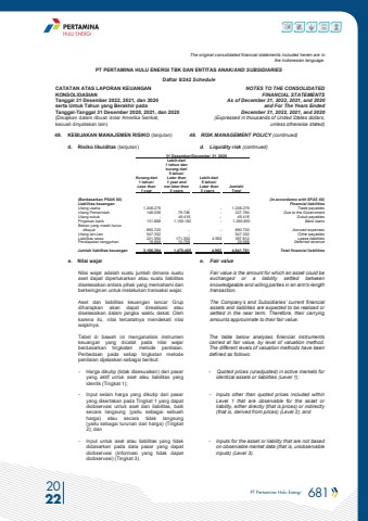 PT Pertamina Hulu Energi 681 2022The original consolidated financial statements included herein are in the Indonesian language.PT PERTAMINA HULU ENERGI TBK DAN ENTITAS ANAK/AND SUBSIDIARIES Daftar 5/242 ScheduleCATATAN ATAS LAPORAN KEUANGANKONSOLIDASIANTanggal 31 Desember 2022, 2021, dan 2020serta Untuk Tahun yang Berakhir padaTanggal-Tanggal 31 Desember 2020, 2021, dan 2020(Disajikan dalam ribuan dolar Amerika Serikat, kecuali dinyatakan lain)NOTES TO THE CONSOLIDATEDFINANCIAL STATEMENTSAs of December 31, 2022, 2021, and 2020and For The Years Ended December 31, 2022, 2021, and 2020 (Expressed in thousands of United States dollars,unless otherwise stated)49. KEBIJAKAN MANAJEMEN RISIKO (lanjutan) 49. RISK MANAGEMENT POLICY (continued)d. Risiko likuiditas (lanjutan) d. Liquidity risk (continued) 31 Desember/December 31, 2020Lebih dari1 tahun dankurang dari5 tahun/Kurang dari Later than Lebih dari1 tahun/ 1 year and 5 tahun/Less than not later than Later than Jumlah/1 year 5 years 5 years Total(Berdasarkan PSAK 60) (In accordance with SFAS 60)Liabilitas keuangan Financial liabilitiesUtang usaha 1.208.279 - - 1.208.279 Trade payablesUtang Pemerintah 148.036 79.748 - 227.784 Due to the GovernmentUtang sukuk - 49.416 - 49.416 Sukuk payablesPinjaman bank 131.668 1.159.182 - 1.290.850 Bank loansBeban yang masih harusdibayar 890.720 - - 890.720 Accrued expensesUtang lain-lain 547.332 - - 547.332 Other payablesLiabilitas sewa 221.550 171.300 4.962 397.812 Lease liabilitiesPendapatan tangguhan 18.809 10.759 - 29.568 Deferred revenue Jumlah liabilitas keuangan 3.166.394 1.470.405 4.962 4.641.761 Total financial liabilities e. Nilai wajar e. Fair valueNilai wajar adalah suatu jumlah dimana suatuaset dapat dipertukarkan atau suatu liabilitasdiselesaikan antara pihak yang memahami danberkeinginan untuk melakukan transaksi wajar.Fair value is the amount for which an asset could be exchanged or a liability settled between knowledgeable and willing parties in an arm's-length transaction.Aset dan liabilitas keuangan lancar Grupdiharapkan akan dapat direalisasi ataudiselesaikan dalam jangka waktu dekat. Olehkarena itu, nilai tercatatnya mendekati nilaiwajarnya.The Company%u2019s and Subsidiaries%u2019 current financial assets and liabilities are expected to be realised or settled in the near term. Therefore, their carrying amounts approximate to their fair value.Tabel di bawah ini menganalisis instrumenkeuangan yang dicatat pada nilai wajarberdasarkan tingkatan metode penilaian.Perbedaan pada setiap tingkatan metodepenilaian dijelaskan sebagai berikut:The table below analyses financial instruments carried at fair value, by level of valuation method. The different levels of valuation methods have been defined as follows:- Harga dikutip (tidak disesuaikan) dari pasaryang aktif untuk aset atau liabilitas yangidentik (Tingkat 1);- Quoted prices (unadjusted) in active markets foridentical assets or liabilities (Level 1);- Input selain harga yang dikutip dari pasaryang disertakan pada Tingkat 1 yang dapatdiobservasi untuk aset dan liabilitas, baiksecara langsung (yaitu sebagai sebuahharga) atau secara tidak langsung(yaitu sebagai turunan dari harga) (Tingkat2); dan- Inputs other than quoted prices included withinLevel 1 that are observable for the asset orliability, either directly (that is prices) or indirectly(that is, derived from prices) (Level 2); and- Input untuk aset atau liabilitas yang tidakdidasarkan pada data pasar yang dapatdiobservasi (informasi yang tidak dapatdiobservasi) (Tingkat 3).- Inputs for the asset or liability that are not basedon observable market data (that is, unobservable inputs) (Level 3).