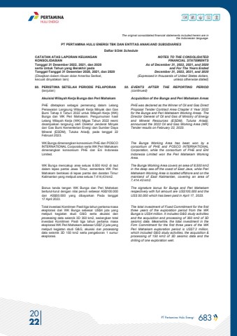 PT Pertamina Hulu Energi 683 2022The original consolidated financial statements included herein are in the Indonesian language.PT PERTAMINA HULU ENERGI TBK DAN ENTITAS ANAK/AND SUBSIDIARIES Daftar 5/244 ScheduleCATATAN ATAS LAPORAN KEUANGANKONSOLIDASIANTanggal 31 Desember 2022, 2021, dan 2020serta Untuk Tahun yang Berakhir padaTanggal-Tanggal 31 Desember 2020, 2021, dan 2020(Disajikan dalam ribuan dolar Amerika Serikat, kecuali dinyatakan lain)NOTES TO THE CONSOLIDATEDFINANCIAL STATEMENTSAs of December 31, 2022, 2021, and 2020and For The Years Ended December 31, 2022, 2021, and 2020 (Expressed in thousands of United States dollars,unless otherwise stated)50. PERISTIWA SETELAH PERIODE PELAPORAN (lanjutan)50. EVENTS AFTER THE REPORTING PERIOD (continued)Akuisisi Wilayah Kerja Bunga dan Peri Mahakam Acquisition of the Bunga and Peri Mahakam AreasPHE ditetapkan sebagai pemenang dalam Lelang Penawaran Langsung Wilayah Kerja Minyak dan Gas Bumi Tahap II Tahun 2022 untuk Wilayah Kerja (WK) Bunga dan WK Peri Mahakam. Pengumuman hasil Lelang Wilayah Kerja (WK) Migas Tahun 2022 resmi disampaikan langsung oleh Direktur Jenderal Minyak dan Gas Bumi Kementerian Energi dan Sumber Daya Mineral (ESDM), Tutuka Ariadji, pada tanggal 22 Februari 2023.WK Bunga dimenangkan konsorsium PHE dan POSCO INTERNATIONAL Corporation serta WK Peri Mahakam dimenangkan konsorsium PHE dan Eni Indonesia Limited.WK Bunga mencakup area seluas 8.500 Km2 di laut dalam lepas pantai Jawa Timur, sementara WK Peri Mahakam berlokasi di lepas pantai dan daratan Timur Kalimantan yang meliputi area seluas 7.414,43 km2.Bonus tanda tangan WK Bunga dan Peri Mahakan berturut-turut dengan nilai penuh sebesar AS$100.000 dan AS$50.000 yang dibayarkan Pada tanggal 17 April 2023.PHE was declared as the Winner of Oil and Gas Direct Proposal Tender Contract Area Chapter II Year 2022 for the Bunga and Peri Mahakam Working Areas. The Director General of Oil and Gas of Ministry of Energy and Mineral Resources (ESDM), Tutuka Ariadji, announced the 2022 Oil and Gas Working Area (WK) Tender results on February 22, 2023.The Bunga Working Area has been won by a consortium of PHE and POSCO INTERNATIONAL Corporation, while the consortium of PHE and ENI Indonesia Limited won the Peri Mahakam Working Area. The Bunga Working Area covers an area of 8,500 km2 in the deep sea off the coast of East Java, while Peri Mahakam Working Area is located offshore and on the mainland of East Kalimantan, covering an area of 7,414.43 km2.The signature bonus for Bunga and Peri Mahakam respectively with full amount are US$100,000 and the US$ 50,000 which has been paid in April 17, 2023.Total investasi Komitmen Pasti tiga tahun pertama masa eksplorasi dari WK Bunga sebesar US$4 juta yang meliputi kegiatan studi G&G serta akuisisi dan processing data seismik 3D 350 km2, sedangkan total investasi Komitmen Pasti tiga tahun pertama masa eksplorasi WK Peri Mahakam sebesar US$7,2 juta yang meliputi kegiatan studi G&G, akuisisi dan processingdata seismik 3D 150 km2 serta pengeboran 1 sumur eksplorasi.The total investment of Fixed Commitment for the first three years of the exploration period from the WK Bunga is US$4 million. It includes G&G study activities and the acquisition and processing of 350 km2 of 3D seismic data. Meanwhile, the total investment in the Firm Commitment for the first three years of the WK Peri Mahakam exploration period is US$7.2 million, which included G&G study activities, the acquisition & processing of 150 km2 of 3D seismic data and the drilling of one exploration well.