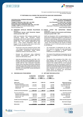 684 PT Pertamina Hulu Energi 2022Laporan TahunanAnnual ReportThe original consolidated financial statements included herein are in the Indonesian language.PT PERTAMINA HULU ENERGI TBK DAN ENTITAS ANAK/AND SUBSIDIARIES Daftar 5/245 ScheduleCATATAN ATAS LAPORAN KEUANGANKONSOLIDASIANTanggal 31 Desember 2022, 2021, dan 2020serta Untuk Tahun yang Berakhir padaTanggal-Tanggal 31 Desember 2020, 2021, dan 2020(Disajikan dalam ribuan dolar Amerika Serikat, kecuali dinyatakan lain)NOTES TO THE CONSOLIDATEDFINANCIAL STATEMENTSAs of December 31, 2022, 2021, and 2020and For The Years Ended December 31, 2022, 2021, and 2020 (Expressed in thousands of United States dollars,unless otherwise stated)50. PERISTIWA SETELAH PERIODE PELAPORAN (lanjutan)50. EVENTS AFTER THE REPORTING PERIOD (continued)Penyelesaian temuan audit Pemerinah Aljazair selama periode 1995 - 2011Settlement of Algerian Governments audit findings during the period 1995 %u2013 2011PAEP dan Sonatrach (%u201cSH%u201d) sebagai perwakilan dari Pemerintah Aljazair telah menyetujui langkah penyelesaian atas temuan audit Sonatrach yang terkait penggantian biaya dan investasi yang terjadi selama periode 1995 - 2011, sebesar AS$38.366.740 (nilai penuh - bruto), dimana berdasarkan risalah rapat tanggal 12 dan 19 Februari 2023 kedua belah pihak telah menyetujui beberapa hal berikut: - Perhitungan ulang atas entitlement periode 1995 - 2011 dengan memasukkan SH audit adjustment menghasilkan pengurangan foreign partner entitlement sebesar 6.928 barrels (bruto).- Dampak dari perhitungan ulang entitlementtersebut mempengaruhi windfall profit taxsebesar 53.082 barrels (bruto).- Hasil dari penyelesaian temuan audit 1995 - 2011 tersebut, baik atas koreksi penggantian biaya dan investasi serta dampak terhadap hasil perhitungan windfall profit tax, akan disesuaikan bersamaan dengan proses rekonsiliasi perhitungan entitlement untuk tahun buku 2022, dimana pada saat Laporan keuangan PAEP ini diselesaikan dan disetujui untuk diterbitkan oleh Direksi PAEP, proses rekonsiliasi ini belum dilakukan. PAEP and Sonatrach (%u201cSH%u201d) as representatives of the Government of Algeria have agreed on a settlement on Sonatrach's audit findings related to reimbursement of costs and investments that occurred during the 1995 - 2011 period, amounting to US$38,366,740 (full amount - gross), which was based on the minutes of meeting on February 12 and 19, 2023 both parties have agreed on the following: - The recalculation of entitlements for the 1995 - 2011 period by including SH audit adjustments resulted in a reduction in foreign partner entitlements of 6,928 barrels (gross)- The impact of the entitlement recalculation has the impact on a windfall profit tax of 53,082 barrels (gross) - The results of the completion of the 1995 - 2011 audit findings, both for the correction of cost reimbursement and investment as well as the impact on the windfall profit tax, will be adjusted simultaneously with the reconciliation process for entitlement calculations for the 2022 financial year, where by the time that PAEP%u2019s financial statement were completed and authorized for issuance by PAEP%u2019s Board of Directors, the reconciliation process had not been carried out.51. REKONSILIASI UTANG BERSIH 51. NET DEBT RECONCILIATION 31 Desember/ 31 Desember/ 31 Desember/ December 31, December 31, December 31, 2022 2021 2020 Pinjaman Loan Saldo awal 2.004.147 2.006.310 1.649.026 Beginning balanceArus kas penerimaan Cash flow receivedPinjaman bank jangka pendek 1.373.387 285.620 170.806 Short term bank loanPinjaman bank jangka panjang 3.708.046 335.000 382.437 Long term bank loanPinjaman lain - lain - 335.094 479.584 Other loanUtang sukuk - - 47.961 Sukuk payables Jumlah arus kas penerimaan 5.081.433 955.714 1.080.788 Total cash flow receivedArus kas pembayaran Cash flow paymentPinjaman bank jangka pendek (1.408.600) (270.988) (160.048) Short term bank loanPinjaman bank jangka panjang (589.135) (107.991) (101.198) Long term bank loanPinjaman lain - lain (286.097) (116.050) (140.302) Other loanUtang sukuk - - - Sukuk payables Jumlah arus kas pembayaran (2.283.833) (495.030) (401.548) Total cash flow paymentPerubahan non-kas (62.658) (462.847) (321.956) Non-Cash changesSaldo akhir 4.739.089 2.004.147 2.006.310 Ending balance