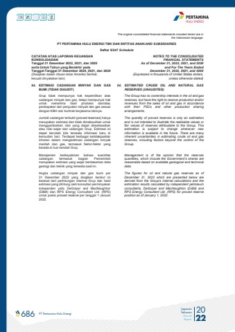 686 PT Pertamina Hulu Energi 2022Laporan TahunanAnnual ReportThe original consolidated financial statements included herein are in the Indonesian language.PT PERTAMINA HULU ENERGI TBK DAN ENTITAS ANAK/AND SUBSIDIARIES Daftar 5/247 ScheduleCATATAN ATAS LAPORAN KEUANGANKONSOLIDASIANTanggal 31 Desember 2022, 2021, dan 2020serta Untuk Tahun yang Berakhir padaTanggal-Tanggal 31 Desember 2020, 2021, dan 2020(Disajikan dalam ribuan dolar Amerika Serikat, kecuali dinyatakan lain)NOTES TO THE CONSOLIDATEDFINANCIAL STATEMENTSAs of December 31, 2022, 2021, and 2020and For The Years Ended December 31, 2022, 2021, and 2020 (Expressed in thousands of United States dollars,unless otherwise stated)54. ESTIMASI CADANGAN MINYAK DAN GAS BUMI (TIDAK DIAUDIT)54. ESTIMATED CRUDE OIL AND NATURAL GAS RESERVES (UNAUDITED) Grup tidak mempunyai hak kepemilikan atas cadangan minyak dan gas, tetapi mempunyai hak untuk menerima hasil produksi dan/atau pendapatan dari penjualan minyak dan gas sesuai dengan KBH dan kontrak kerjasama lainnya.The Group has no ownership interests in the oil and gas reserves, but have the right to receive production and/or revenues from the sales of oil and gas in accordance with their PSCs and other production sharing arrangements.Jumlah cadangan terbukti (proved reserves) hanya merupakan estimasi dan tidak dimaksudkan untuk menggambarkan nilai yang dapat direalisasikan atau nilai wajar dari cadangan Grup. Estimasi ini dapat berubah bila tersedia informasi baru di kemudian hari. Terdapat berbagai ketidakpastian inheren dalam mengestimasi cadangan minyak mentah dan gas, termasuk faktor-faktor yang berada di luar kendali Grup.The quantity of proved reserves is only an estimation and is not intended to illustrate the realizable values or fair values of reserves attributable to the Group. This estimation is subject to change whenever new information is available in the future. There are many inherent uncertainties in estimating crude oil and gas reserves, including factors beyond the control of the Group.Manajemen berkeyakinan bahwa kuantitas cadangan termasuk bagian Pemerintah merupakan estimasi yang wajar berdasarkan data geologi dan teknik yang tersedia saat ini.Management is of the opinion that the reserves quantities, which include the Government%u2019s shares are reasonable based on available geological and technical data.Angka cadangan minyak dan gas bumi per 31 Desember 2022 yang disajikan berikut ini berasal dari perhitungan internal Grup dan hasil estimasi yang dihitung oleh konsultan perminyakan independen yaitu DeGolyer and MacNaughton (D&M) dan RPS Energy Consultant Ltd. (RPS) untuk posisi proved reserve per tanggal 1 Januari 2022.The figures for oil and natural gas reserves as of December 31, 2022 which are presented below are derived from the Group's internal calculations and the estimation results calculated by independent petroleum consultants, DeGolyer and MacNaughton (D&M) and RPS Energy Consultant Ltd. (RPS) for proved reserve position as of January 1, 2022.
