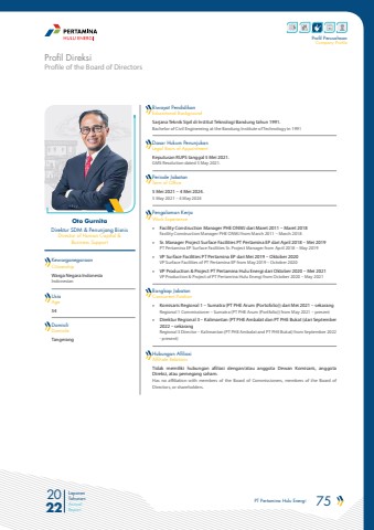 PT Pertamina Hulu Energi 75 2022Laporan TahunanAnnual ReportProfil PerusahaanCompany ProfileProfile of the Board of DirectorsProfil DireksiOto GurnitaDirektur SDM & Penunjang BisnisDirector of Human Capital & Business SupportKewarganegaraanCitizenshipRiwayat PendidikanEducational BackgroundDasar Hukum PenunjukanLegal Basis of AppointmentPeriode JabatanTerm of OfficeHubungan AfiliasiAffiliate RelationsPengalaman KerjaWork ExperienceRangkap JabatanUsia Concurrent PositionAgeDomisili DomicileWarga Negara Indonesia IndonesianSarjana Teknik Sipil di Institut Teknologi Bandung tahun 1991.Bachelor of Civil Engineering at the Bandung Institute of Technology in 1991Keputusan RUPS tanggal 5 Mei 2021.GMS Resolution dated 5 May 2021.5 Mei 2021 %u2013 4 Mei 2024.5 May 2021 %u2013 4 May 2024Tidak memiliki hubungan afiliasi dengan/atau anggota Dewan Komisaris, anggota Direksi, atau pemegang saham.Has no affiliation with members of the Board of Commissioners, members of the Board of Directors, or shareholders.%u00bb Facility Construction Manager PHE ONWJ dari Maret 2011 %u2013 Maret 2018Facility Construction Manager PHE ONWJ from March 2011 %u2013 March 2018%u00bb Sr. Manager Project Surface Facilities PT Pertamina EP dari April 2018 %u2013 Mei 2019PT Pertamina EP Surface Facilities Sr. Project Manager from April 2018 %u2013 May 2019%u00bb VP Surface Facilities PT Pertamina EP dari Mei 2019 %u2013 Oktober 2020VP Surface Facilities of PT Pertamina EP from May 2019 %u2013 October 2020%u00bb VP Production & Project PT Pertamina Hulu Energi dari Oktober 2020 %u2013 Mei 2021VP Production & Project of PT Pertamina Hulu Energi from October 2020 %u2013 May 2021%u00bb Komisaris Regional 1 %u2013 Sumatra (PT PHE Arum (Portofolio)) dari Mei 2021 %u2013 sekarangRegional 1 Commissioner %u2013 Sumatra (PT PHE Arum (Portfolio)) from May 2021 %u2013 present%u00bb Direktur Regional 3 %u2013 Kalimantan (PT PHE Ambalat dan PT PHE Bukat (dari September 2022 %u2013 sekarangRegional 3 Director %u2013 Kalimantan (PT PHE Ambalat and PT PHE Bukat) from September 2022 - present)54Tangerang