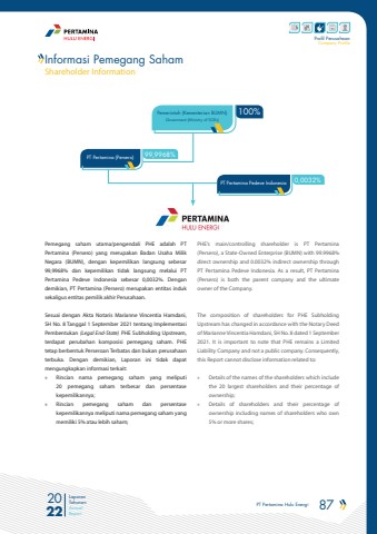 PT Pertamina Hulu Energi 87 2022Laporan TahunanAnnual ReportProfil PerusahaanCompany ProfilePemerintah (Kementerian BUMN)Government (Ministry of SOEs)PT Pertamina (Persero)PT Pertamina Pedeve Indonesia100%99,9968%0,0032%Pemegang saham utama/pengendali PHE adalah PT Pertamina (Persero) yang merupakan Badan Usaha Milik Negara (BUMN), dengan kepemilikan langsung sebesar 99,9968% dan kepemilikan tidak langsung melalui PT Pertamina Pedeve Indonesia sebesar 0,0032%. Dengan demikian, PT Pertamina (Persero) merupakan entitas induk sekaligus entitas pemilik akhir Perusahaan.Sesuai dengan Akta Notaris Marianne Vincentia Hamdani, SH No. 8 Tanggal 1 September 2021 tentang Implementasi Pembentukan (Legal End-State) PHE Subholding Upstream, terdapat perubahan komposisi pemegang saham. PHE tetap berbentuk Perseroan Terbatas dan bukan perusahaan terbuka. Dengan demikian, Laporan ini tidak dapat mengungkapkan informasi terkait:%u00bb Rincian nama pemegang saham yang meliputi20 pemegang saham terbesar dan persentasekepemilikannya; %u00bb Rincian pemegang saham dan persentasekepemilikannya meliputi nama pemegang saham yang memiliki 5% atau lebih saham; PHE%u2019s main/controlling shareholder is PT Pertamina (Persero), a State-Owned Enterprise (BUMN) with 99.9968% direct ownership and 0.0032% indirect ownership through PT Pertamina Pedeve Indonesia. As a result, PT Pertamina (Persero) is both the parent company and the ultimate owner of the Company.The composition of shareholders for PHE Subholding Upstream has changed in accordance with the Notary Deed of Marianne Vincentia Hamdani, SH No. 8 dated 1 September 2021. It is important to note that PHE remains a Limited Liability Company and not a public company. Consequently, this Report cannot disclose information related to:%u00bb Details of the names of the shareholders which includethe 20 largest shareholders and their percentage ofownership;%u00bb Details of shareholders and their percentage ofownership including names of shareholders who own5% or more shares;Informasi Pemegang SahamShareholder Information