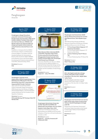 PT Pertamina Hulu Energi 9 2022Laporan TahunanAnnual ReportIkhtisar 20222022 HighlightsPenghargaan sebagai Perusahaan yang telah memenuhi Perlindungan, Penghormatan dan Pemulihan HAM sesuai Standar Indikator Penilaian Risiko Bisnis dan Hak Asasi Manusia (PRISMA) oleh Menteri Hukum dan Hak Asasi Manusia dengan pencapaian kriteria advanced rating Pertamina Industrial Peace Level (PIPL).Awarded as a Company that has fulfilled the Protection, Respect, and Restoration of Human Rights in accordance with the Standard Indicators for Assessment of Business Risk and Human Rights (PRISMA) by the Minister of Law and Human Rights by achieving the Pertamina Industrial Peace Level (PIPL) advanced rating criteria.Rekor Museum Rekor Indonesia (MURI) untuk Rekor Anjungan Lepas Pantai Pertama yang Seluruhnya Beroperasi Menggunakan Energi Surya dan rekor Fasilitas Produksi Migas dan Pemasangan Panel Energi Surya TerbanyakIndonesian World Records Museum (MURI) record for the First Offshore Platform to Operate Entirely Using Solar Energy and the record for the Most Oil and Gas Production Facilities and the Installation of Solar Energy PanelsPenghargaan Corporate Social Responsibility (CSR) & Pengembangan Desa Berkelanjutan (PDB) Awards 2022 dari Kementerian Desa PDTT, yang diserahkan langsung Wakil Presiden Indonesia2022 Corporate Social Responsibility (CSR) & Sustainable Village Development (PDB) Awards from the Ministry of Villages, Disadvantaged Regions, and Transmigration, handed directly by the Vice President of the Republic of Indonesia.Penerima | RecipientPHEPenerima | RecipientRegional 2 %u2013 Jawa, PHE ONWJPenerima | RecipientPHE Jambi Merang, PEP Pendopo Field, PEP Ramba FieldAgustus 2022August 202211 Agustus 2022August 11th 202208 Agustus 2022August 08th 2022AwardsPenghargaanPenghargaan Kementerian Energi dan Sumber Daya Mineral (ESDM) atas Keberhasilan Pemanfaatan Gas Suar dalam Kegiatan Usaha Migas Tahun 2022Award from the Ministry of Energy and Mineral Resources (ESDM) for the Successful Utilization of Flare Gas in Oil and Gas Business Activities in 2022Penerima | RecipientRegional 1 %u2013 Sumatra, Pertamina EP Prabumulih Field18 Agustus 2022August 18th 2022Penghargaan dari Kementerian ESDM berupa Dharma Karya Energi dan Sumber Daya Mineral Tahun 2022 kepada Gugus CIP:2022 Dharma Karya Energi and Mineral Resources Award from the Ministry of Energy and Mineral Resources to the CIP Group:1. PC Prove Krayan Reborn Regional 1 PT Pertamina Hulu RokanPC Prove Krayan Reborn Regional 1 PT Pertamina Hulu Rokan2. FT Prove Thickening Team PT Elnusa TbkFT Prove Thickening Team PT Elnusa TbkPenerima | RecipientPHR, PT Elnusa Tbk04 Oktober 2022October 04th 2022IDIA : Best Digital Leadership in Energy Industry 2022 & Best Leader in Digital Innovation of The Year 2022 : Bapak Akbar Yudha PuteraIDIA : Best Digital Leadership in Energy Industry 2022 & Best Leader in Digital Innovation of The Year 2022 : Mr Akbar Yudha PuteraPenerima | RecipientPHE10 Oktober 2022October 10th 2022Penghargaan dari Pemerintah dan Asosiasi Paten Taiwan pada Taiwan Innotech Expo: Platinum Award (Penghargaan tertinggi pada TIE)Awards from the Taiwanese Government and Taiwan Patent Association at the Taiwan Innotech Expo: Platinum Award (Highest award at TIE)Penerima | RecipientPHE15 Oktober 2022October 15th 2022