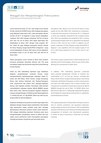 96 PT Pertamina Hulu Energi 2022Laporan TahunanAnnual ReportProfil PerusahaanCompany Profilesurvei seismik 3D seluas 371 km2. Dari target survei seismik 2D dan seismik 3D di RKAP tahun 2022 terdapat percepatan yang dilakukan pada tahun 2021, yaitu percepatan akuisisi seismik 2D KE-11 di Regional 4 yang semula ditargetkan multiyear 2021-2022 dengan komposisi 220 km di tahun 2021 dan 241 km di tahun 2022 dapat dipercepat dan diselesaikan di tahun 2021 dengan total program 461 km. Selain itu juga terdapat percepatan akuisisi seismik 3D Pulau Panjang Sungai Buluh/PPSB di Regional 1 yang semula ditargetkan di tahun 2022 seluas 310 km2 dilakukan percepatan seluas 41 km2 di tahun 2021 dan 269 km2 di tahun 2022.Dalam pencapaian survei seismik di tahun 2022 tersebut termasuk penerapan teknologi Vibroseis dan FTG yang merupakan bagian dari Komitmen Kerja Pasti Jambi Merang di Area Terbuka.Selain itu, PHE Subholding Upstream juga melakukan kegiatan pengembangan potensial lainnya untuk mempertahankan keberlangsungan cadangan migas P1, antara lain WK Rokan, North Senoro, Sungai Kenawang, Banyu Urip Existing Carbonate, dan Mutiara-Pamaguan serta reassessment dan project baru lapangan-lapangan lainnya. Dari kegiatan tersebut, Perusahaan telah berhasil menambahkan cadangan sebesar 485,60 MMBOE sampai akhir tahun 2022. Seluruh pencapaian kegiatan eksplorasi maupun pengembangan ini didukung oleh Rig pengeboran 71 Drilling Rig dan 131 Rig WOWS (Work Over Well Service) yang tersebar di seluruh Regional.Eksplorasi terhadap semua potensi sumber daya migas terus dilakukan dengan harapan dapat memberikan nilai tambah bagi pemenuhan target produksi yang akan menjaga keberlanjutan keamanan pasokan energi untuk Indonesia. PHE sebagai Subholding Upstream Pertamina akan terus mengembangkan pengelolaan operasi di dalam dan luar negeri secara profesional untuk mewujudkan pencapaian menjadi perusahaan minyak dan gas bumi kelas dunia.throughout 2022. Based on the 2D and 3D seismic survey targets for the 2022 RKAP, 2021 witnessed an acceleration. In particular, the acquisition of 2D seismic KE-11 in Regional 4, which was originally scheduled for the multiyear period 2021-2022, was expedited and completed in 2021, covering a total program length of 461 km as opposed to the planned 220 km in 2021 and 241 km in 2022. In addition, the 3D seismic acquisition of Pulau Panjang Sungai Buluh/PPSB in Regional 1 was expedited, with the original target of 310 km2 in 2022 being reduced to 41 km2 in 2021 and 271 km2in 2022.The seismic survey%u2019s achievements in 2022 include the use of Vibroseis and FTG technologies, which are part of the Jambi Merang Firm Commitment in Open Areas.In addition, PHE Subholding Upstream conducted other potential development activities to maintain the sustainability of P1 oil and gas reserves, including WK Rokan, North Senoro, Sungai Kenawang, Banyu Urip Existing Carbonate, and Mutiara-Pamaguan as well as reassessments and other new field projects. Due to these activities, the Company has succeeded in increasing its reserves by 485.60 MMBOE through the end of 2022. 131 WOWS (Work Over Well Service) Rigs and 71 Drilling Rigs dispersed throughout all the Regionals supported all achievements in exploration and development activities.The ongoing exploration of all possible oil and gas resources aims to enhance production and guarantee Indonesia%u2019s energy supply security for the long term. PHE, as Subholding Upstream of Pertamina, will continue to develop professional management of domestic and international operations to realize its goal of becoming a world-class oil and gas company.Exploring and Developing PotentialsMenggali dan Mengembangkan Potensi-potensi