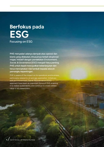 8 Laporan Tahunan %u2022 PT Pertamina Hulu EnergiPHE menyadari adanya dampak atas operasi dan bisnis yang dilakukan, khususnya terkait eksplorasi migas. Inisiatif dengan pendekatan Environment, Social, & Governance (ESG) menjadi fokus penting PHE untuk dapat mewujudkan keberlanjutan dan terus menciptakan nilai tambah kepada seluruh pemangku kepentingan.PHE is aware of the impact on its operations and business, particularly related to oil and gas exploration. Initiatives with an Environment, Social, &Governance (ESG) approach have been an important focus of PHE enabling it to realize sustainability and continue to create added value to all stakeholders. Berfokus padaESGFocusing on ESG8 Laporan Tahunan %u2022 PT Pertamina Hulu Energi