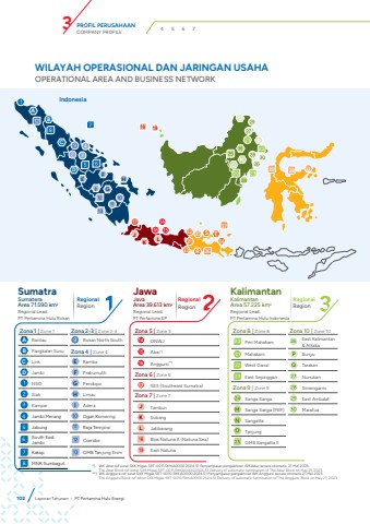 102WILAYAH OPERASIONAL DAN JARINGAN USAHAOPERATIONAL AREA AND BUSINESS NETWORK7Indonesia2426Zona 1 | Zone 1 Zona 2-3 | Zone 2-3A Rantau Rokan North SouthB Pangkalan Susu Zona 4 | Zone 4C Lirik E RambaD Jambi F PrabumulihNSO G PendopoSiak H Limau3 Kampar I Adera4 Jambi Merang Ogan Komering5 Jabung 11 Raja Tempirai6 South East Jambi CorridorKakap GMB Tanjung EnimMNK SumbagutRegionalRegionSumatraSumateraArea 71.590 km2Regional Lead:PT Pertamina Hulu RokanZona 5 | Zone 5ONWJAbar*)Anggursi**)Zona 6 | Zone 6SES (Southeast Sumatra) Zona 7 | Zone 7J TambunK SubangL JatibarangBlok Natuna A (Natuna Sea)East NatunaRegionalRegionJawaJavaArea 39.613 km2Regional Lead:PT Pertamina EPRegionalRegionKalimantanKalimantanArea 57.225 km2Regional Lead:PT Pertamina Hulu IndonesiaZona 8 | Zone 8 Zona 10 | Zone 1020 Peri Mahakam 26 East Kalimantan & AttakaMahakam P BunyuWest Ganal Q TarakanEast Sepinggan NunukanZona 9 | Zone 9 SimengarrisSanga Sanga East AmbalatM Sanga Sanga (PEP) MaratuaN SangattaO TanjungGMB Sangatta II3132333435363739 38ABCDEFGHIJK LRS TONPUQ17*) WK Abar ref surat SKK Migas SRT-0011.SKKIA0000.2024.S1 Penyampaian pengakhiran WK Abar secara otomatis 21 Mei 2023.The Abar Block ref letter SKK Migas SRT-0011.SKKIA0000.2024.S1 Delivery of automatic termination of The Abar Block on May 21, 2023. **) WK Anggursi ref surat SKK Migas SRT-0010.SKKIA0000.2024.S1 Penyampaian pengakhiran WK Anggursi secara otomatis 21 Mei 2023.The Anggursi Block ref letter SKK Migas SRT-0010.SKKIA0000.2024.S1 Delivery of automatic termination of The Anggursi Block on May 21, 2023.Laporan Tahunan %u2022 PT Pertamina Hulu EnergiPROFIL PERUSAHAANCOMPANY PROFILE 3 4 5 6 7