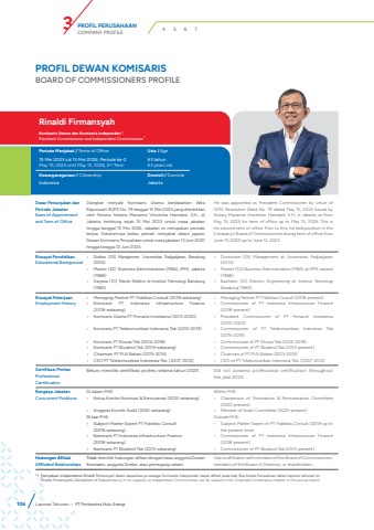 106Dasar Penunjukan dan Periode JabatanBasis of Appointment and Term of OfficeDiangkat menjadi Komisaris Utama berdasarkan Akta Keputusan RUPS No. 79 tanggal 15 Mei 2023 yang diterbitkan oleh Notaris Notaris Marianne Vincentia Hamdani, S.H., di Jakarta, terhitung sejak 15 Mei 2023 untuk masa jabatan hingga tanggal 15 Mei 2026. Jabatan ini merupakan periode kedua. Sebelumnya beliau pernah menjabat dalam jajaran Dewan Komisaris Perusahaan untuk masa jabatan 13 Juni 2020 hingga tanggal 12 Juni 2023.He was appointed as President Commissioner by virtue of GMS Resolution Deed No. 79 dated May 15, 2023 issued by Notary Marianne Vincentia Hamdani, S.H., in Jakarta, as from May 15, 2023 for term of office up to May 15, 2026. This is his second term of office. Prior to this, he held position in the Company%u2019s Board of Commissioners during term of office from June 13, 2020 up to June 12, 2023.Riwayat PendidikanEducational Background%u2022 Doktor (S3) Manajemen, Universitas Padjadjaran, Bandung(2014)%u2022 Master (S2) Business Administration (MBA), IPMI, Jakarta (1988)%u2022 Sarjana (S1) Teknik Elektro di Institut Teknologi Bandung(1985)%u2022 Doctorate (S3) Management at Universitas Padjadjaran(2014).%u2022 Master (S2) Business Administration (MBA) at IPMI Jakarta (1988).%u2022 Bachelor (S1) Electric Engineering at Institut TeknologiBandung (1985).Riwayat PekerjaanEmployment History%u2022 Managing Partner PT Fidelitas Consult (2018-sekarang)%u2022 Komisaris PT Indonesia Infrastructure Finance(2018-sekarang)%u2022 Komisaris Utama PT Pinnacle Investama (2015-2020)%u2022 Komisaris PT Telekomunikasi Indonesia Tbk (2015-2019)%u2022 Komisaris PT Elnusa Tbk (2014-2018)%u2022 Komisaris PT Bluebird Tbk (2013-sekarang)%u2022 Chairman PT PLN Batam (2013-2016)%u2022 CEO PT Telekomunikasi Indonesia Tbk. (2007-2012)%u2022 Managing Partner PT Fidelitas Consult (2018-present)%u2022 Commissioner of PT Indonesia Infrastructure Finance(2018-present)%u2022 President Commissioner of PT Pinnacle Investama(2015-2020)%u2022 Commissioner of PT Telekomunikasi Indonesia Tbk(2015-2019)%u2022 Commissioner of PT Elnusa Tbk (2014-2018)%u2022 Commissioner of PT Bluebird Tbk (2013-present)%u2022 Chairman of PT PLN Batam (2013-2016)%u2022 CEO of PT Telekomunikasi Indonesia Tbk. (2007-2012)Sertifikasi ProfesiProfessional CertificationBelum memiliki sertifikasi profesi selama tahun 2023. Did not possess professional certification throughout the year 2023.Rangkap JabatanConcurrent PositionsDi dalam PHE: %u2022 Ketua Komite Nominasi & Remunerasi (2022-sekarang)%u2022 Anggota Komite Audit (2022-sekarang)Di luar PHE:%u2022 Subject Matter Expert PT Fidelitas Consult (2018-sekarang)%u2022 Komisaris PT Indonesia Infrastructure Finance(2018-sekarang)%u2022 Komisaris PT Bluebird Tbk (2013-sekarang)Within PHE: %u2022 Chairperson of Nomination & Remuneration Committee(2022-present)%u2022 Member of Audit Committee (2022-present)Outside PHE:%u2022 Subject Matter Expert of PT Fidelitas Consult (2018-up tothe present time)%u2022 Commissioner of PT Indonesia Infrastructure Finance(2018-present)%u2022 Commissioner of PT Bluebird Tbk (2013-present)Hubungan AfiliasiAffiliated RelationshipsTidak memiliki hubungan afiliasi dengan/atau anggota Dewan Komisaris, anggota Direksi, atau pemegang saham.Has no affiliation with members of the Board of Commissioners, members of the Board of Directors, or shareholders.Rinaldi FirmansyahKomisaris Utama dan Komisaris Independen*)President Commissioner and Independent Commissioner*)Periode Menjabat / Terms of Office Usia / Age15 Mei 2023 s.d 15 Mei 2026, Periode ke-2May 15, 2023 until May 15, 2026, 2nd Term63 tahun63 years oldKewarganegaraan / Citizenship Domisili / DomicileIndonesia JakartaPROFIL DEWAN KOMISARISBOARD OF COMMISSIONERS PROFILE *) Pernyataan independensi Rinaldi Firmansyah dalam kapasitasnya sebagai Komisaris Independen dapat dilihat pada bab Tata Kelola Perusahaan dalam laporan tahunan ini.Rinaldi Firmansyah%u2019s Declaration of Independency in his capacity as Independent Commissioner can be viewed in the Corporate Governance chapter in this annual report. Laporan Tahunan %u2022 PT Pertamina Hulu EnergiPROFIL PERUSAHAANCOMPANY PROFILE 3 4 5 6 7