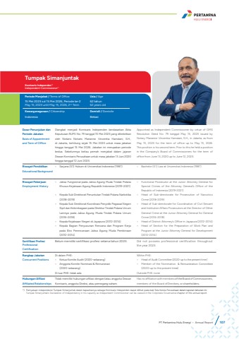 Dasar Penunjukan dan Periode JabatanBasis of Appointment and Term of OfficeDiangkat menjadi Komisaris Independen berdasarkan Akta Keputusan RUPS No. 79 tanggal 15 Mei 2023 yang diterbitkan oleh Notaris Notaris Marianne Vincentia Hamdani, S.H., di Jakarta, terhitung sejak 15 Mei 2023 untuk masa jabatan hingga tanggal 15 Mei 2026. Jabatan ini merupakan periode kedua. Sebelumnya beliau pernah menjabat dalam jajaran Dewan Komisaris Perusahaan untuk masa jabatan 13 Juni 2020 hingga tanggal 12 Juni 2023.Appointed as Independent Commissioner by virtue of GMS Resolution Deed No. 79 tanggal May 15, 2023 issued byNotary Marianne Vincentia Hamdani, S.H., in Jakarta, as from May 15, 2023 for the term of office up to May 15, 2026. This position is his second term. Prior to this he held a position in the Company%u2019s Board of Commissioners for the term of office from June 13, 2020 up to June 12, 2023.Riwayat PendidikanEducational Background%u2022 Sarjana (S1) Hukum di Universitas Indonesia (1987) %u2022 Bachelor (S1) Law at Universitas Indonesia (1987)Riwayat PekerjaanEmployment History%u2022 Jaksa Fungsional pada Jaksa Agung Muda Tindak Pidana Khusus Kejaksaan Agung Republik Indonesia (2019-2021)%u2022 Kepala Sub Direktorat Penuntutan Tindak Pidana Narkotika (2018-2019)%u2022 Kepala Sub Direktorat Koordinasi Penyidik Pegawai Negeri Sipil dan Kelembagaan pada Direktur Tindak Pidana Umum Lainnya pada Jaksa Agung Muda Tindak Pidana Umum (2016-2018)%u2022 Kepala Kejaksaan Negeri di Jayapura (2012-2014)%u2022 Kepala Bagian Penyusunan Rencana dan Program Kerja pada Biro Perencanaan Jaksa Agung Muda Pembinaan (2012-2014)%u2022 Functional Prosecutor at the Junior Attorney General for Special Crimes of the Attorney General%u2019s Office of the Republic of Indonesia (2019-2021)%u2022 Head of Sub-directorate for Prosecution of Narcotics Crime (2018-2019)%u2022 Head of Sub-directorate for Coordination of Civil Servant and Institution Affairs Prosecutors at the Director of Other General Crime at the Junior Attorney General for General Crime (2016-2018)%u2022 Head of District Attorney%u2019s Office in Jayapura (2012-2014)%u2022 Head of Section for the Preparation of Work Plan and Program at the Junior Attorney General for Development (2012-2014)Sertifikasi ProfesiProfessional CertificationBelum memiliki sertifikasi profesi selama tahun 2023. Did not possess professional certification throughout the year 2023.Rangkap JabatanConcurrent PositionsDi dalam PHE: %u2022 Ketua Komite Audit (2020-sekarang)%u2022 Anggota Komite Nominasi & Remunerasi (2020-sekarang)Di luar PHE: tidak adaWithin PHE:%u2022 Head of Audit Committee (2020-up to the present time)%u2022 Member of the Nomination & Remuneration Committee (2020-up to the present time)Outside PHE: noneHubungan AfiliasiAffiliated RelationshipsTidak memiliki hubungan afiliasi dengan/atau anggota Dewan Komisaris, anggota Direksi, atau pemegang saham.Has no affiliation with members of the Board of Commissioners, members of the Board ofDirectors, or shareholders.*) Pernyataan independensi Tumpak Simanjuntak dalam kapasitasnya sebagai Komisaris Independen dapat dilihat pada bab Tata Kelola Perusahaan dalam laporan tahunan ini. Tumpak Simanjuntak%u2019s Declaration of Independency in his capacity as Independent Commissioner can be viewed in the Corporate Governance chapter of this annual report. Tumpak SimanjuntakKomisaris Independen*)Independent Commissioner*)Periode Menjabat / Terms of Office Usia / Age15 Mei 2023 s.d 15 Mei 2026, Periode ke-2May 15, 2023 until May 15, 2026, 2nd Term62 tahun62 years oldKewarganegaraan / Citizenship Domisili / DomicileIndonesia BekasiPT Pertamina Hulu Energi %u2022 Annual Report 107