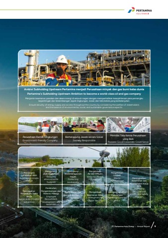 PT Pertamina Hulu Energi %u2022 Annual Report 9Ambisi Subholding Upstream Pertamina menjadi Perusahaan minyak dan gas bumi kelas duniaPertamina's Subholding Upstream Ambition to become a world-class oil and gas companyMenjamin keamanan pasokan dan akses energi di seluruh negeri dengan memperhatikan kesejahteraan para pemangku kepentingan dan keseimbangan aspek lingkungan, sosial, dan tata kelola yang berkelanjutan.Ensure security of energy supply and access throughout the country by considering the welfare of stakeholders and the balance of environmental, social, and sustainable governance aspects.Perusahaan Ramah LingkunganEnvironment-friendly CompanyBertanggung Jawab secara SosialSocially ResponsibleMemiliki Tata Kelola Perusahaan yang BaikPossess Good Corporate GovernanceMenanganiperubahan iklimAddressing climate changeMengurangijejak lingkunganReducing environmental footprintMelindungikeanekaragaman hayatiProtecting biodiversityPengelolaanAir dan EffluenWater & Effluent ManagementPengelolaan LimbahWaste ManagementMeningkatkan Kesehatan dan Keselamatan Kerja (K3)Improving Occupational Health and Safety (OHS)PencegahanKecelakaan Skala BesarLarge-scale incident preventionPerekrutan, Pengembangan dan Retensi PekerjaEmployee Recruitment, Development, and Retention Keterlibatan dan Dampak KomunitasCommunity EmpowermentMemperkuatKeamanan SiberStrengthening Digital SecurityMemperkuat etikaPerusahaanImproving Company ethicsPT Pertamina Hulu Energi %u2022 Annual Report 9
