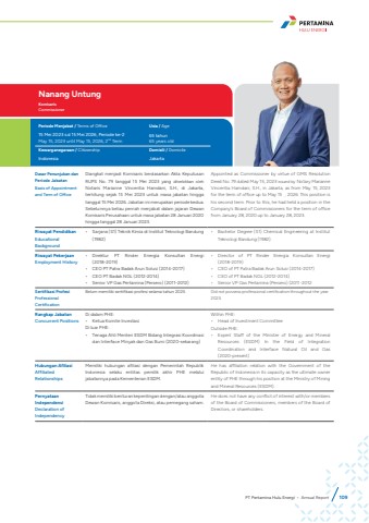 Dasar Penunjukan dan Periode JabatanBasis of Appointment and Term of OfficeDiangkat menjadi Komisaris berdasarkan Akta Keputusan RUPS No. 79 tanggal 15 Mei 2023 yang diterbitkan olehNotaris Marianne Vincentia Hamdani, S.H., di Jakarta, terhitung sejak 15 Mei 2023 untuk masa jabatan hingga tanggal 15 Mei 2026. Jabatan ini merupakan periode kedua. Sebelumnya beliau pernah menjabat dalam jajaran Dewan Komisaris Perusahaan untuk masa jabatan 28 Januari 2020 hingga tanggal 28 Januari 2023.Appointed as Commissioner by virtue of GMS Resolution Deed No. 79 dated May 15, 2023 issued by Notary Marianne Vincentia Hamdani, S.H., in Jakarta, as from May 15, 2023 for the term of office up to May 15 , 2026. This position is his second term. Prior to this, he had held a position in the Company%u2019s Board of Commissioners for the term of office from January 28, 2020 up to January 28, 2023.Riwayat PendidikanEducational Background%u2022 Sarjana (S1) Teknik Kimia di Institut Teknologi Bandung (1982)%u2022 Bachelor Degree (S1) Chemical Engineering at Institut Teknologi Bandung (1982).Riwayat PekerjaanEmployment History%u2022 Direktur PT Rinder Energia Konsultan Energi (2018-2019)%u2022 CEO PT Patra Badak Arun Solusi (2014-2017)%u2022 CEO PT Badak NGL (2012-2014)%u2022 Senior VP Gas Pertamina (Persero) (2011-2012)%u2022 Director of PT Rinder Energia Konsultan Energi (2018-2019)%u2022 CEO of PT Patra Badak Arun Solusi (2014-2017)%u2022 CEO of PT Badak NGL (2012-2014)%u2022 Senior VP Gas Pertamina (Persero) (2011-2012Sertifikasi ProfesiProfessional CertificationBelum memiliki sertifikasi profesi selama tahun 2023. Did not possess professional certification throughout the year 2023.Rangkap JabatanConcurrent PositionsDi dalam PHE: %u2022 Ketua Komite InvestasiDi luar PHE:%u2022 Tenaga Ahli Menteri ESDM Bidang Integrasi Koordinasi dan Interface Minyak dan Gas Bumi (2020-sekarang)Within PHE: %u2022 Head of Investment CommitteeOutside PHE:%u2022 Expert Staff of the Minister of Energy and Mineral Resources (ESDM) In the Field of Integration Coordination and Interface Natural Oil and Gas (2020-present)Hubungan AfiliasiAffiliated RelationshipsMemiliki hubungan afiliasi dengan Pemerintah Republik Indonesia selaku entitas pemilik akhir PHE melalui jabatannya pada Kementerian ESDM.He has affiliation relation with the Government of the Republic of Indonesia in its capacity as the ultimate owner entity of PHE through his position at the Ministry of Mining and Mineral Resources (ESDM).Pernyataan IndependensiDeclaration of IndependencyTidak memiliki benturan kepentingan dengan/atau anggota Dewan Komisaris, anggota Direksi, atau pemegang saham.He does not have any conflict of interest with/or members of the Board of Commissioners, members of the Board of Directors, or shareholders.Nanang UntungKomisarisCommissionerPeriode Menjabat / Terms of Office Usia / Age15 Mei 2023 s.d 15 Mei 2026, Periode ke-2May 15, 2023 until May 15, 2026, 2nd Term65 tahun65 years oldKewarganegaraan / Citizenship Domisili / DomicileIndonesia JakartaPT Pertamina Hulu Energi %u2022 Annual Report 109