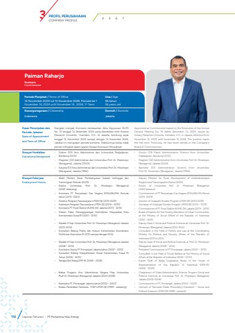 112Dasar Penunjukan dan Periode JabatanBasis of Appointment and Term of OfficeDiangkat menjadi Komisaris berdasarkan Akta Keputusan RUPS No. 16 tanggal 14 Desember 2023 yang diterbitkan oleh Notaris Marianne Vincentia Hamdani, S.H., di Jakarta, terhitung sejak tanggal 14 November 2023 sampai dengan 14 November 2026. Jabatan ini merupakan periode pertama. Sebelumnya beliau tidak pernah menjabat dalam jajaran Dewan Komisaris Perusahaan.Appointed as Commissioner based on the Resolution of the Annual General Meeting No. 16 dated December 14, 2023, issued by Notary Marianne Vincentia Hamdani, S.H., in Jakarta, effective from November 14, 2023, until November 14, 2026. This position marks the first term. Previously, he had never served on the Company's Board of Commissioners.Riwayat PendidikanEducational Background%u2022 Doktor (S3) Ilmu Administrasi dari Universitas Padjadjaran,Bandung (2012)%u2022 Magister (S2) Administrasi dari Universitas Prof. Dr. Moestopo (Beragama), Jakarta (2003)%u2022 Sarjana (S1) Ilmu Administrasi dari Universitas Prof. Dr. Moestopo (Beragama), Jakarta (1994)%u2022 Doctor (S3) Public Administration Science from UniversitasPadjadjaran, Bandung (2012)%u2022 Magister (S2) Administration from Universitas Prof. Dr. Moestopo (Beragama), Jakarta (2003)%u2022 Bachelor (S1) Administration Science from UniversitasProf. Dr. Moestopo (Beragama), Jakarta (1994)Riwayat PekerjaanEmployment History%u2022 Wakil Menteri Desa, Pembangunan Daerah tertinggal danTransmigrasi Periode (2023)%u2022 Rektor Universitas Prof. Dr. Moestopo (Beragama)(2022-sekarang)%u2022 Komisaris PT Perusahaan Gas Negara (PGN)/BUMN Periodetahun (2015 -2023)%u2022 Direktur Program Pascasarjana UPDM (B) (2015-2019)%u2022 Sekretaris Program Pascasarjana UPDM (B) (2014 %u2013 2015)%u2022 Komisaris PT Food Station BUMD DKI Jakarta (2013 - 2015)%u2022 Dewan Pakar Penanggulangan Kemiskinan Masyarakat KotaKementerian Sosial RI (2010 - 2015)%u2022%u2022 Wadek II Fisip Universitas Prof. Dr. Moestopo (Beragama) Jakarta (2012-2014)%u2022 Konsultan Bidang Politik dan Hukum Kementerian KoordinatorPolitik dan Keamanan RI 2010 sampai dengan 2014%u2022 Wadek III Fisip Universitas Prof. Dr. Moestopo (Beragama) Jakarta(2008 %u2013 2012)%u2022 Komisaris Utama PT Primasejati Jakarta tahun (2007 %u2013 2012)%u2022 Konsultan Bidang Kesejahteraan Sosial Kementerian Sosial RITahun (2006 %u2013 2010)%u2022 Tenaga Ahli Baleg DPR-RI (2006 %u2013 2009)%u2022 Ketua Program Ilmu Administrasi Negara Fisip UniversitasProf. Dr. Moestopo (Beragama) Jakarta (2003-2008)%u2022 Komisaris PT. Primasejati Jakarta tahun (2002 %u2013 2007)%u2022 Dosen Pendidikan Pancasila - FISIP UPDM (B) (1999 %u2013 sekarang)%u2022 Deputy Minister for Rural, Development of UnderdevelopedRegions and Transmigration Period (2023)%u2022 Rector of Universitas Prof. Dr. Moestopo (Beragama)(2022-present)%u2022 Commissioner of PT Perusahaan Gas Negara (PGN)/BUMN Period (2015 -2023)%u2022 Director of Graduate Studies Program UPDM (B) (2015-2019)%u2022 Secretary of Graduate Studies Program UPDM (B) (2014 %u2013 2015)%u2022 Commissioner of PT Food Station BUMD DKI Jakarta (2013 - 2015)%u2022 Board of Experts for the Poverty Alleviation of Urban Communities at the Ministry of Social Affairs of the Republic of Indonesia(2010 - 2015)%u2022 Deputy Dean II Social and Political Sciences at Universitas Prof. Dr. Moestopo (Beragama) Jakarta (2012-2014)%u2022 Consultant in the Field of Politics and Law at the CoordinatingMinistry for Political and Security Affairs of the Republic ofIndonesia 2010 to 2014%u2022 Deputy Dean III Social and Political Sciences at Prof. Dr. Moestopo (Beragama) Jakarta (2008 %u2013 2012)%u2022 President Commissioner of PT Primasejati Jakarta (2007 %u2013 2012)%u2022 Consultant in the Field of Social Welfare at the Ministry of SocialAffairs of the Republic of Indonesia (2006 %u2013 2010)%u2022 Expert Staff of Baleg (Legislative Body) of the House ofRepresentatives of the Republic of Indonesia (DPR-RI)(2006 %u2013 2009)%u2022 Chairperson of State Administration Science Program Social andPolitical Sciences at Universitas Prof. Dr. Moestopo (Beragama)Jakarta (2003-2008)%u2022 Commissioner of PT. Primasejati Jakarta (2002 %u2013 2007)%u2022 Lecturer of Pancasila (State Philosophy) Education %u2013 Social andPolitical Sciences UPDM (B) (1999 %u2013 present)Paiman RaharjoKomisarisCommissionerPeriode Menjabat / Terms of Office Usia / Age14 November 2023 s.d 14 November 2026, Periode ke-1November 14, 2023 until November 14 , 2026, 1st Term56 tahun56 years oldKewarganegaraan / Citizenship Domisili / DomicileIndonesia JakartaLaporan Tahunan %u2022 PT Pertamina Hulu EnergiPROFIL PERUSAHAANCOMPANY PROFILE 3 4 5 6 7