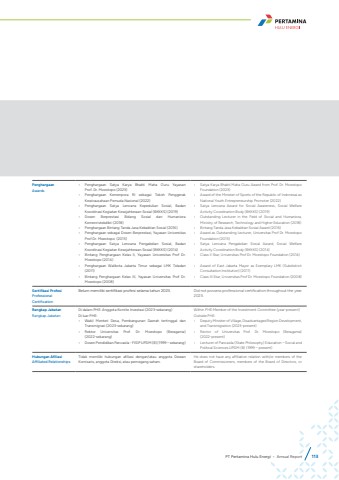 PenghargaanAwards%u2022 Penghargaan Satya Karya Bhakti Maha Guru Yayasan Prof. Dr. Moestopo (2023)%u2022 Penghargaan Kemenpora RI sebagai Tokoh Penggerak Kewirausahaan Pemuda Nasional (2022)%u2022 Penghargaan Satya Lencana Kepedulian Sosial, Badan Koordinasi Kegiatan Kesejahteraan Sosial (BKKKS) (2019)%u2022 Dosen Berprestasi Bidang Sosial dan Humaniora Kemenristekdikti (2018)%u2022 Penghargaan Bintang Tanda Jasa Kebaktian Sosial (2016)%u2022 Penghargaan sebagai Dosen Berprestasi, Yayasan Universitas Prof Dr. Moestopo (2015)%u2022 Penghargaan Satya Lencana Pengabdian Sosial, Badan Koordinasi Kegiatan Kesejahteraan Sosial (BKKKS) (2014)%u2022 Bintang Penghargaan Kelas II, Yayasan Universitas Prof Dr. Moestopo (2014)%u2022 Penghargaan Walikota Jakarta Timur sebagai LMK Teladan (2011)%u2022 Bintang Penghargaan Kelas III, Yayasan Universitas Prof Dr. Moestopo (2008)%u2022 Satya Karya Bhakti Maha Guru Award from Prof. Dr. Moestopo Foundation (2023)%u2022 Award of the Minister of Sports of the Republic of Indonesai as National Youth Entrepreneurship Promoter (2022)%u2022 Satya Lencana Award for Social Awareness, Social Welfare Activity Coordination Body (BKKKS) (2019)%u2022 Outstanding Lecturer in the Field of Social and Humaniora, Ministry of Research, Technology and Higher Education (2018)%u2022 Bintang Tanda Jasa Kebaktian Sosial Award (2016)%u2022 Award as Outstanding Lecturer, Universitas Prof Dr. Moestopo Foundation (2015)%u2022 Satya Lencana Pengabdian Sosial Award, Social Welfare Activity Coordination Body (BKKKS) (2014)%u2022 Class II Star, Universitas Prof Dr. Moestopo Foundation (2014)%u2022 Award of East Jakarta Mayor as Exemplary LMK (Subdistrict Consultation Institution) (2011)%u2022 Class III Star, Universitas Prof Dr. Moestopo Foundation (2008)Sertifikasi ProfesiProfessional CertificationBelum memiliki sertifikasi profesi selama tahun 2023. Did not possess professional certification throughout the year 2023.Rangkap JabatanRangkap JabatanDi dalam PHE: Anggota Komite Investasi (2023-sekarang)Di luar PHE:%u2022 Wakil Menteri Desa, Pembangunan Daerah tertinggal dan Transmigrasi (2023-sekarang)%u2022 Rektor Universitas Prof. Dr. Moestopo (Beragama) (2022-sekarang)%u2022 Dosen Pendidikan Pancasila - FISIP UPDM (B) (1999 %u2013 sekarang)Within PHE:Member of the Investment Committee (year-present)Outside PHE:%u2022 Deputy Minister of Village, Disadvantaged Region Development, and Transmigration (2023-present)%u2022 Rector of Universitas Prof. Dr. Moestopo (Beragama) (2022-present)%u2022 Lecturer of Pancasila (State Philosophy) Education %u2013 Social and Political Sciences UPDM (B) (1999 %u2013 present)Hubungan AfiliasiAffiliated RelationshipsTidak memiliki hubungan afiliasi dengan/atau anggota Dewan Komisaris, anggota Direksi, atau pemegang saham.He does not have any affiliation relation with/or members of the Board of Commissioners, members of the Board of Directors, or shareholders.PT Pertamina Hulu Energi %u2022 Annual Report 113
