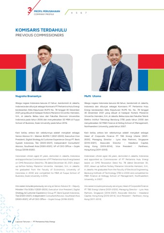 114Nugroho Bramantyo Warga negara Indonesia berusia 41 tahun, berdomisili di Jakarta, Indonesia dan ditunjuk sebagai Komisaris PT Pertamina Hulu Energi berdasarkan Akta Keputusan RUPS No. 78 tanggal 30 Desember 2021 yang dibuat di hadapan Notaris Marianne Vincentia Hamdani, S.H., di Jakarta. Beliau lulus dari Fakultas Ekonomi UniversitasIndonesia pada tahun 2006 dan menyelesaikan S2 MBA di FuquaSchool of Business, Duke University pada tahun 2016. Karir beliau antara lain sebelumnya adalah menjabat sebagai Senior Advisor III %u2013 Wamen BUMN 1 (2021-2023), Executive Vice President, Digital Strategy & Customer Experience Group PT. Bank Syariah Indonesia, Tbk (2020-2021), Independent Consultant/Advisor, Southeast Asia (2020-2021), VP of CEO Office %u2013 Gojek Group (2018-2020).Indonesian citizen aged 41 years, domiciled in Jakarta, Indonesia and appointed as Commissioner of PT Pertamina Hulu Energi based on GMS Resolution Deed No. 78 dated December 30, 2021, drawn up before Notary Marianne Vincentia Hamdani, S.H., in Jakarta. He graduated from the Faculty of Economics, University of Indonesia in 2000 and completed his MBA at Fuqua School of Business, Duke University in 2016. His career includes previously serving as Senior Advisor III %u2013 Deputy Minister 1 for SOEs 1 (2021-2023), Executive Vice President, Digital Strategy & Customer Experience Group PT. Bank Syariah Indonesia, Tbk (2020-2021), Independent Consultant/Advisor, Southeast Asia (2020-2021), VP of CEO Office %u2013 Gojek Group (2018-2020).Mufti UtomoWarga negara Indonesia berusia 46 tahun, berdomisili di Jakarta, Indonesia dan ditunjuk sebagai Komisaris PT Pertamina Hulu Energi berdasarkan Akta Keputusan RUPS No. No. 78 tanggal 30 Desember 2021 yang dibuat di hadapan Notaris Marianne Vincentia Hamdani, S.H., di Jakarta. Beliau lulus dari Fakultas Teknik Elektro Institut Teknologi Bandung (ITB) pada tahun 2000 dan menyelesaikan S2 MBA Finance di Kellog School of Management, Northwestern University, pada tahun 2007. Karir beliau antara lain sebelumnya adalah menjabat sebagai Head of Corporate Finance PT TBS Energi Utama (2021-2023), Managing Director - Lynx Asia Partners, Singapore (2014-2021), Associate Director - Headland Capital, Hong Kong (2013-2014), Vice President - Pantheon, Hong Kong (2011-2013). Indonesian citizen aged 46 years, domiciled in Jakarta, Indonesia and appointed as Commissioner of PT Pertamina Hulu Energi based on GMS Resolution Deed No. 78 dated December 30, 2021, drawn up before Notary Marianne Vincentia Hamdani, S.H., in Jakarta. He graduated from the Faculty of Electrical Engineering, Bandung Institute of Technology (ITB) in 2000 and completed his MBA Finance at Kellogg School of Management, Northwestern University, in 2007. His career includes previously serving as, Head of Corporate Finance PT TBS Energi Utama (2021-2023), Managing Director - Lynx Asia Partners, Singapore (2014-2021), Associate Director - Headland Capital, Hong Kong (2013-2014), Vice President - Pantheon, Hong Kong (2011-2013).KOMISARIS TERDAHULUPREVIOUS COMMISSIONERSLaporan Tahunan %u2022 PT Pertamina Hulu EnergiPROFIL PERUSAHAANCOMPANY PROFILE 3 4 5 6 7