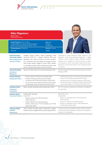 116Dasar Penunjukan dan Periode JabatanBasis of Appointment and Term of OfficeDiangkat menjadi Direktur Utama berdasarkan Akta Keputusan RUPS No. 1 tanggal 3 Oktober 2022 yang diterbitkan oleh Notaris Marianne Vincentia Hamdani, S.H., di Jakarta, untuk masa jabatan dari tanggal 15 Maret2022 sampai dengan tanggal 31 Januari 2024. Jabatanini merupakan periode pertama. Sebelumnya beliau tidakpernah menjabat dalam jajaran Direksi Perusahaan.Appointed as Chief Executive Officer based on the Resolution of the Annual General Meeting No. 1 dated October 3, 2022, issued by Notary Marianne Vincentia Hamdani, S.H., in Jakarta, for a term from March 15, 2022, until January 31, 2024. This position marks the first term. Previously, he had never served on the Company's Board of Directors.Riwayat PendidikanEducational BackgroundSarjana (S1) Teknik Mesin di Universitas Brawijaya (1992) Bachelor Degree (S1) Mechanical Engineering at Universitas Brawijaya (1992).Riwayat PekerjaanEmployment History%u2022 Direktur Utama PT Pertamina Gas (2018-2022)%u2022 VP LNG PT Pertamina (Persero) (2017-2018)%u2022 VP Natural Gas PT Pertamina (Persero) (2015-2017)%u2022 VP Gas Sourcing PT Pertamina (Persero) (2013-2015)%u2022 Field Manager Jambi PT Pertamina EP (2012-2013)%u2022 Chief Executive Officer of PT Pertamina Gas (2018-2022)%u2022 VP LNG of PT Pertamina (Persero) (2017-2018)%u2022 VP Natural Gas of PT Pertamina (Persero) (2015-2017)%u2022 VP Gas Sourcing of PT Pertamina (Persero) (2013-2015)%u2022 Jambi Field Manager of PT Pertamina EP (2012-2013)Sertifikasi ProfesiProfessional CertificationBelum memiliki sertifikasi profesi selama tahun 2023. Did not possess professional certification throughout the year 2023.Rangkap JabatanConcurrent PositionsDi dalam PHE: tidak adaDi luar PHE:%u2022 Direktur entitas anak, PHE Oil & Gas B.V (2022-sekarang)%u2022 Direktur Natuna 2 B.V (2022-sekarang)%u2022 Direktur entitas anak, PT PHE Ambalat dan PT PHEBukat (2022-2023)Within PHE: noneOutside PHE:%u2022 Director of subsidiary entity, PHE Oil & Gas B.V(2022-present)%u2022 Director of Natuna 2 B.V (2022-present)%u2022 Director of subsidiary entity, PT PHE Ambalat andPT PHE Bukat (2022-2023)Hubungan AfiliasiAffiliated RelationshipsTidak memiliki hubungan afiliasi dengan/atau anggota Dewan Komisaris, anggota Direksi, atau pemegang saham.He does not have any affiliation relation with/or members of the Board of Commissioners, members of the Board of Directors, or shareholders.Wiko Migantoro Direktur UtamaChief Executive OfficerPeriode Menjabat / Terms of Office Usia / Age15 Maret 2022 s.d 31 Januari 2024, Periode ke-1March 15, 2022 until January 31, 2024, 1st Term55 tahun55 years oldKewarganegaraan / Citizenship Domisili / DomicileIndonesia JakartaLaporan Tahunan %u2022 PT Pertamina Hulu EnergiPROFIL PERUSAHAANCOMPANY PROFILE 3 4 5 6 7
