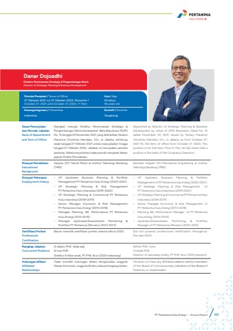 Dasar Penunjukan dan Periode JabatanBasis of Appointment and Term of OfficeDiangkat menjadi Direktur Perencanaan Strategis & Pengembangan Bisnis berdasarkan Akta Keputusan RUPS No. 16 tanggal 23 November 2021 yang diterbitkan Notaris Marianne Vincentia Hamdani, S.H., di Jakarta, terhitung sejak tanggal 27 Oktober 2021 untuk masa jabatan hingga tanggal 27 Oktober 2024. Jabatan ini merupakan periode pertama. Sebelumnya beliau tidak pernah menjabat dalam jajaran Direksi Perusahaan.Appointed as Director of Strategic Planning & Business Development by virtue of GMS Resolution Deed No. 16 dated November 23, 2021 issued by Notary Marianne Vincentia Hamdani, S.H., in Jakarta, as from October 27, 2021 for the term of office from October 27, 2024. This position is his first term. Prior to this, he had never held a position in the ranks of the Company%u2019s Directors.Riwayat PendidikanEducational BackgroundSarjana (S1) Teknik Mesin di Institut Teknologi Bandung (1992)Bachelor Degree (S1) Mechanical Engineering at Institut Teknologi Bandung (1992)Riwayat PekerjaanEmployment History%u2022 VP Upstream Business Planning & Portfolio Management PT Pertamina Hulu Energi (2020-2021)%u2022 VP Strategic Planning & Risk ManagementPT Pertamina Hulu Indonesia (2019-2020)%u2022 VP Strategic Planning & Commercial PT Pertamina Hulu Indonesia (2018-2019)%u2022 Senior Manager Economic & Risk ManagementPT Pertamina Hulu Energi (2015-2018)%u2022 Manager Planning, BD, Performance PT Pertamina Hulu Energi (2013-2015)%u2022 Manager Upstream/Downstream Monitoring & Portfolio PT Pertamina (Persero) (2012-2013)%u2022 VP Upstream Business Planning & Portfolio Management of PT Pertamina Hulu Energi (2020-2021).%u2022 VP Strategic Planning & Risk Management of PT Pertamina Hulu Indonesia (2019-2020)%u2022 VP Strategic Planning & Commercial PT Pertamina Hulu Indonesia (2018-2019)%u2022 Senior Manager Economic & Risk Management of PT Pertamina Hulu Energi (2015-2018)%u2022 Planning, BD, Performance Manager of PT Pertamina Hulu Energi (2013-2015)%u2022 Upstream/Downstream Monitoring & Portfolio Manager of PT Pertamina (Persero) (2012-2013)Sertifikasi ProfesiProfessional CertificationBelum memiliki sertifikasi profesi selama tahun 2023. Did not possess professional certification throughout the year 2023.Rangkap JabatanConcurrent PositionsDi dalam PHE: tidak adaDi luar PHE: Direktur Entitas anak, PT PHE Arun (2023-sekarang)Within PHE: noneOutside PHE:Director of subsidiary entity, PT PHE Arun (2023-present)Hubungan AfiliasiAffiliated RelationshipsTidak memiliki hubungan afiliasi dengan/atau anggota Dewan Komisaris, anggota Direksi, atau pemegang saham.He does not have any affiliation relation with/or members of the Board of Commissioners, members of the Board of Directors, or shareholders.Danar DojoadhiDirektur Perencanaan Strategis & Pengembangan BisnisDirector of Strategic Planning & Business DevelopmentPeriode Menjabat / Terms of Office Usia / Age27 Oktober 2021 s.d 27 Oktober 2024, Period ke-1October 27, 2021 until October 27, 2024, 1st Term55 tahun55 years oldKewarganegaraan / Citizenship Domisili / DomicileIndonesia TangerangPT Pertamina Hulu Energi %u2022 Annual Report 117