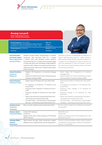 118Dasar Penunjukan dan Periode JabatanBasis of Appointment and Term of OfficeDiangkat menjadi Direktur Pengembangan & Produksi berdasarkan Akta Keputusan RUPS No. 1 tanggal 3 Oktober 2022 yang diterbitkan Notaris Marianne Vincentia Hamdani, S.H., di Jakarta, terhitung sejak tanggal 27 September 2022 untuk masa jabatan hingga tanggal 27 September 2025. Jabatan ini merupakan periode pertama. Sebelumnya beliau tidak pernah menjabat dalam jajaran Direksi Perusahaan.Appointed as Director of Development & Production by virtue of GMS Resolution Deed No. 1 dated October 3, 2022 issued by Notary Marianne Vincentia Hamdani, S.H., in Jakarta, as from September 27, 2022 for the term of office from September 27, 2025. This position is his first term. Prior to this, he had never held a position in the ranks of the Company%u2019s Directors.Riwayat PendidikanEducational Background%u2022 Magister (S2) Manajemen di Universitas Airlangga(2012)%u2022 Sarjana (S1) Teknik Kimia di Institut Teknologi Sepuluh Nopember Surabaya (1998)%u2022 Master Degree (S2) Management at UniversitasAirlangga (2012)%u2022 Bachelor Degree (S1) Chemical Engineering at InstitutTeknologi Sepuluh Nopember Surabaya (1998)Riwayat PekerjaanEmployment History%u2022 Direktur Utama PT Pertamina EP Cepu (2020-2022)%u2022 VP Operations & Production PT Pertamina HuluEnergi (2020)%u2022 Production Senior Manager PT Pertamina EP (2017-2019)%u2022 Production Manager PT Pertamina EP Cepu (2016-2017)%u2022 Deputy Cepu Operations Superintendent Blok Cepu - JOA Pertamina-ExxonMobil (2015-2016)%u2022 Full Field Facility - Field Operations SuperintendentBlok Cepi - JOA Pertamina-ExxonMobil (2012-2015)%u2022 Chief Executive Officer PT Pertamina EP Cepu (2020-2022)%u2022 VP Operations & Production of PT Pertamina HuluEnergi (2020)%u2022 Production Senior Manager of PT Pertamina EP(2017-2019)%u2022 Production Manager of PT Pertamina EP Cepu(2016-2017)%u2022 Deputy Cepu Operations Superintendent Cepu Block -JOA Pertamina-ExxonMobil (2015-2016)%u2022 Full Field Facility - Field Operations SuperintendentCepi Block - JOA Pertamina-ExxonMobil (2012-2015)Sertifikasi ProfesiProfessional CertificationBelum memiliki sertifikasi profesi selama tahun 2023. Did not possess professional certification throughout the year 2023.Rangkap JabatanConcurrent PositionsDi dalam PHE: tidak adaDi luar PHE: Direktur Entitas anak, PT PHE Ambalat dan PT PHE Bukat (2023-sekarang) Within PHE: noneOutside PHE:Director of subsidiary entity, PT PHE Ambalat and PT PHE Bukat (2023-present)Hubungan AfiliasiAffiliated RelationshipsTidak memiliki hubungan afiliasi dengan/atau anggota Dewan Komisaris, anggota Direksi, atau pemegang saham.He does not have any affiliation relation with/or members of the Board of Commissioners, members of the Board of Directors, or shareholders.Awang Lazuardi Direktur Pengembangan & ProduksiDirector of Development & ProductionPeriode Menjabat / Terms of Office Usia / Age27 September 2022 s.d 27 September 2025, Period ke-1September 27, 2022 until September 27, 2025, 1st Term49 tahun49 years oldKewarganegaraan / Citizenship Domisili / DomicileIndonesia TangerangLaporan Tahunan %u2022 PT Pertamina Hulu EnergiPROFIL PERUSAHAANCOMPANY PROFILE 3 4 5 6 7