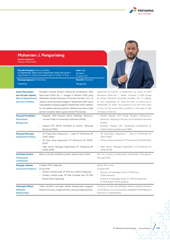Dasar Penunjukan dan Periode JabatanBasis of Appointment and Term of OfficeDiangkat menjadi Direktur Eksplorasi berdasarkan Akta Keputusan RUPS No. 1 tanggal 3 Oktober 2022 yang diterbitkan Notaris Marianne Vincentia Hamdani, S.H., di Jakarta, terhitung sejak tanggal 27 September 2022 untuk masa jabatan hingga tanggal 27 September 2025. Jabatan ini merupakan periode pertama. Sebelumnya beliau tidak pernah menjabat dalam jajaran Direksi Perusahaan.Appointed as Director of Exploration by virtue of GMS Resolution Deed No. 1 dated October 3, 2022 issued by Notary Marianne Vincentia Hamdani, S.H., in Jakarta, as from September 27, 2022 for term of office up to September 27, 2025. This position is his first term. Prior to this, he had never held a position in the ranks of the Company%u2019s Directors.Riwayat PendidikanEducational Background%u2022 Magister (S2) Program Studi Geofisika, Reservoir, Jurusan Fisika di Universitas Indonesia (2008)%u2022 Sarjana (S1) Teknik Geofisika di Institut Teknologi Bandung (1996)%u2022 Master Degree (S2) Study Program Geophysics, Reservoir, Majoring in Physics at Universitas Indonesia (2008)%u2022 Bachelor Degree (S1) Geophysial Engineering at Institut Teknologi Bandung (1996)Riwayat PekerjaanEmployment History%u2022 VP Exploration Regional 2 - Jawa PT Pertamina EP (2021-2022)%u2022 VP East Area Exploration PT Pertamina EP (2018-2021)%u2022 G&G Senior Manager Exploitation PT Pertamina EP (2016-2018)%u2022 VP Exploration Regional 2 - Java PT Pertamina EP (2021-2022)%u2022 VP East Area Exploration PT Pertamina EP (2018-2021)%u2022 G&G Senior Manager Exploitation PT Pertamina EP (2016-2018)Sertifikasi ProfesiProfessional CertificationBelum memiliki sertifikasi profesi selama tahun 2023. Did not possess professional certification throughout the year 2023.Rangkap JabatanConcurrent PositionsDi dalam PHE: tidak adaDi luar PHE:%u2022 Direktur entitas anak, PT PHE Arun (2023-sekarang)%u2022 Direktur entitas anak, PT PHE Ambalat dan PT PHE Bukat (2023-sekarang)Within PHE: noneOutside PHE:%u2022 Director of subsidiary entity, PT PHE Arun (2023-present)%u2022 Director of subsidiary entity, PT PHE Ambalat and PT PHE Bukat (2023-present)Hubungan AfiliasiAffiliated RelationshipsTidak memiliki hubungan afiliasi dengan/atau anggota Dewan Komisaris, anggota Direksi, atau pemegang saham.He does not have any affiliation relation with/or members of the Board of Commissioners, members of the Board of Directors, or shareholders.Muharram J. PangurisengDirektur EksplorasiDirector of ExplorationPeriode Menjabat / Terms of Office Usia / Age27 September 2022 s.d 27 September 2025, Period ke-1September 27, 2022 until September 27, 2025, 1st Term52 tahun52 years oldKewarganegaraan / Citizenship Domisili / DomicileIndonesia TangerangPT Pertamina Hulu Energi %u2022 Annual Report 119
