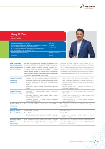 Dasar Penunjukan dan Periode JabatanBasis of Appointment and Term of OfficeDiangkat menjadi Direktur Keuangan berdasarkan Akta Keputusan RUPS No. 79 tanggal 15 Mei 2023 yang dibuat di hadapan Notaris Marianne Vincentia Hamdani, S.H., di Jakarta, untuk masa jabatan dari tanggal 15 Mei 2023 sampai dengan tanggal 20 Februari 2024. Sebelumnya beliau menjabat sebagai Direktur Keuangan untuk periode 16 Juli 2020 sampai dengan 14 Mei 2023. Appointed as Chief Financial Officer based on the Resolution of the Annual General Meeting No. 79 dated May 15, 2023, executed before Notary Marianne Vincentia Hamdani, S.H., in Jakarta, for a term from May 15, 2023, until February 20, 2024. Previously, he served as Chief Financial Officer for the period from July 16, 2020, until May 14, 2023. Riwayat PendidikanEducational Background%u2022 Magister (S2) Business Administration (MBA) bidang Corporate Finance and Financial Institutions & Market di State University of New York, Amerika Serikat (1996)%u2022 Sarjana (S1) Teknik Metalurgi di Universitas Indonesia (1993)%u2022 Master Degree (S2) Business Administration (MBA) major Corporate Finance and Financial Institutions & Market at State University of New York, United States of America (1996)%u2022 Bachelor Degree (S1) Metallurgy Engineering at Universitas Indonesia (1993)Riwayat PekerjaanEmployment History%u2022 Komisaris PT Telekomunikasi Seluler (Telkomsel) (2016-2020)%u2022 Komisaris Utama PT Graha Sarana Duta (Telkom Property) (2016-2020)%u2022 President Director PT Credit Suisse Securities Indonesia (2008-2015)%u2022 Commissioner of PT Telekomunikasi Seluler (Telkomsel) (2016-2020)%u2022 President Commissioner of PT Graha Sarana Duta (Telkom Property) (2016-2020)%u2022 President Director of PT Credit Suisse Securities Indonesia (2008-2015)Sertifikasi ProfesiProfessional CertificationBelum memiliki sertifikasi profesi selama tahun 2023. Did not possess professional certification throughout the year 2023.Rangkap JabatanConcurrent PositionsDi dalam PHE: tidak adaDi luar PHE:%u2022 Direktur entitas anak, Maurel et Prom (2021-sekarang)Within PHE: noneOutside PHE:%u2022 Director of subsidiary entity, Maurel et Prom (2021-present)Hubungan AfiliasiAffiliated RelationshipsTidak memiliki hubungan afiliasi dengan/atau anggota Dewan Komisaris, anggota Direksi, atau pemegang saham.He does not have any affiliation relation with/or members of the Board of Commissioners, members of the Board of Directors, or shareholders.Harry M. ZenDirektur KeuanganDirector of FinancePeriode Menjabat / Terms of Office Usia / Age15 Mei 2023 sampai dengan tanggal 20 Februari 2024, Period ke-2May 15, 2023 until February 20, 2024, 2nd Term16 Juli 2020 sampai dengan tanggal 15 Mei 2023, Period ke-1July 16, 2020 until May 15, 2023, 1stTerm54 tahun54 years oldKewarganegaraan / Citizenship Domisili / DomicileIndonesia JakartaPT Pertamina Hulu Energi %u2022 Annual Report 121