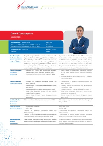124Dasar Penunjukan dan Periode JabatanBasis of Appointment and Term of OfficeDiangkat menjadi Direktur Utama berdasarkan Akta Keputusan RUPS No. 52 tanggal 27 Februari 2024 yang dibuat di hadapan Notaris Marianne Vincentia Hamdani, S.H., di Jakarta, untuk masa jabatan dari tanggal 20 Februari 2024 sampai dengan tanggal 20 Februari 2027. Jabatanini merupakan periode pertama. Sebelumnya beliau tidakpernah menjabat dalam jajaran Direksi Perusahaan.Appointed as the Chief Executive Officer based on the Resolution of the Annual General Meeting (AGM) No. 52 dated February 27, 2024, executed before Notary Marianne Vincentia Hamdani, S.H., in Jakarta, for a term from February 20, 2024, until February 20, 2027. This position marks the first term. Prior to this, he has never held a position in the Company's Board of Directors.Riwayat PendidikanEducational Background%u2022 Magister (S2) Finance and International Business,Stern Business School, New York University (1997) %u2022 Sarjana (S1) Akuntansi, Universitas Indonesia (1992)%u2022 Master Degree (S2) Finance and International Business(M.F.I.B.), Stern Business School, New York University(1997)%u2022 Bachelor Degree (S1) Accountancy (B.Acc.), University of Indonesia (1992)Riwayat PekerjaanEmployment History%u2022 Komisaris, PT Pertamina Geothermal Energy Tbk(2023-sekarang)%u2022 Direktur Utama, PT Pertamina New & Renewable Energy (2021-2024)%u2022 President Director, PT Mandiri Sekuritas (2019-2021).%u2022 Group Head Corporate Banking, PT Bank Mandiri(Persero) Tbk (2018-2019)%u2022 Country Head, PT Bank Mandiri Singapore Branch(2015-2018)%u2022 Commissioner, PT Pertamina Geothermal Energy Tbk(2023-present)%u2022 President Director, PT Pertamina New & RenewableEnergy (2021-2024)%u2022 President Director, PT Mandiri Sekuritas (2019-2021).%u2022 Group Head Corporate Banking, PT Bank Mandiri(Persero) Tbk (2018-2019)%u2022 Country Head, PT Bank Mandiri Singapore Branch(2015-2018)Sertifikasi ProfesiProfessional CertificationBelum memiliki sertifikasi profesi selama tahun 2023. Did not possess professional certification throughout the year 2023.Rangkap JabatanConcurrent Positions%u2022 Di dalam PHE: tidak ada%u2022 Di luar PHE:Komisaris, PT Pertamina Geothermal Energy Tbk(2023-sekarang)Komisaris, PT Industri Baterai Indonesia (Indonesia Battery Corporation/IBC) (sampai dengan Desember 2023)Within PHE: noneOutside PHE: Commissioner, PT Pertamina Geothermal Energy Tbk (2023-present)Commissioner, PT Industri Baterai Indonesia (Indonesia Battery Corporation/IBC) (until December 2023)Hubungan AfiliasiAffiliated RelationshipsTidak memiliki hubungan afiliasi dengan/atau anggota Dewan Komisaris, anggota Direksi, atau pemegang saham.He does not have any affiliation relation with/or members of the Board of Commissioners, members of the Board of Directors, or shareholders.Dannif DanusaputroDirektur KeuanganDirector of Finance Periode Menjabat / Terms of Office Usia / Age20 Februari 2024 s.d 20 Februari 2027, Period ke-1February 20, 2024 until February 20, 2027, 1st Term55 tahun55 years oldKewarganegaraan / Citizenship Domisili / DomicileIndonesia JakartaLaporan Tahunan %u2022 PT Pertamina Hulu EnergiPROFIL PERUSAHAANCOMPANY PROFILE 3 4 5 6 7