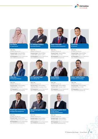 Eri Sulistyo SutiknoChief Audit ExecutiveUsia / Age 46 tahun / 46 years oldMenjabat Sejak / Terms of Office1 Januari 2023 / January 1, 2023SK Pengangkatan / Decree of AppointmentSKMJ-00189/K20000/2022-S8Asep ChaerudinVP Policy and Risk ManagementUsia / Age 53 tahun / 53 years oldMenjabat Sejak / Terms of Office11 Mei 2023 / May 11, 2023SK Pengangkatan / Decree of AppointmentSKMJ-00063/K20000/2023-S8CaesarianVP ControllerUsia / Age 47 tahun / 47 years oldMenjabat Sejak / Terms of Office11 Maret 2022 / March 11, 2022SK Pengangkatan / Decree of AppointmentSKMJ-003/PHM000/2022-S8Villia SimVP Financing & TreasuryUsia / Age 48 tahun / 48 years oldMenjabat Sejak / Terms of Office25 Mei 2022 / May 25, 2022SK Pengangkatan / Decree of AppointmentSKMJ-00001/PHR00000/2022-S8Arif Syamsul HadiSenior Manager TaxUsia / Age 54 tahun / 54 years oldMenjabat Sejak / Terms of Office1 Desember 2021 / December 1, 2021SK Pengangkatan / Decree of AppointmentSKMJ-00389/PHE51000/2021-S8Linda DelinaVP Human CapitalUsia / Age 47 tahun / 47 years oldMenjabat Sejak / Terms of Office1 Oktober 2023 / October 1, 2023SK Pengangkatan / Decree of AppointmentSKMJ-00135/K20000/2022-S8Akbar Yudha PuteraVP Information TechnologyUsia / Age 47 tahun / 47 years oldMenjabat Sejak / Terms of Office25 Mei 2022 / May 25, 2022SK Pengangkatan / Decree of AppointmentSKMJ-00001/PIP00000/2022-S8Geri Simansyah AchsanVP HSSEUsia / Age 49 tahun / 49 years oldMenjabat Sejak / Terms of Office9 Agustus 2022 / August 9, 2022SK Pengangkatan / Decree of AppointmentSKMJ-00009/PHE50000/2022-S8Devialina Puspita DewiVP D&P Technical Excellence & CoordinationUsia / Age 47 tahun / 47 years oldMenjabat Sejak / Terms of Office18 Januari 2024 / January 18, 2024SK Pengangkatan / Decree of AppointmentSKMJ-00002/PHE50000/2024-S8Eva MariaVP Legal CounselUsia / Age 46 tahun / 46 years oldMenjabat Sejak / Terms of Office1 Oktober 2020 / October 1, 2020SK Pengangkatan / Decree of AppointmentSKMJ-00695/K20000/2020-S8Bongbongan TampubolonVP Supply Chain ManagementUsia / Age 50 tahun / 50 years oldMenjabat Sejak / Terms of Office1 September 2023 / September 1, 2023SK Pengangkatan / Decree of AppointmentSKMJ-00010/PHE50000/2023-S8PT Pertamina Hulu Energi %u2022 Annual Report 127