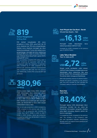 819Sumur PengeboranDrilling WellPHE berhasil menyelesaikan 819 sumur pengeboran di tahun 2023, yang terdiri dari 20 sumur eksplorasi dan 799 sumur pengembangan. Realisasi sumur eksplorasi meningkat dari tahun sebelumnya sebanyak 17 sumur dan realisasi sumur pengembangan meningkat dari tahun sebelumnya sebanyak 689 sumur. Selain itu di tahun 2023 PHE juga melakukan Kerja Ulang Pindah Lapisan (KUPL) sebanyak 837 sumur.PHE successfully completed 819 drilling wells in 2023, comprising 20 exploration wells and 799 development wells. The realization of exploration wells increased by 17 wells compared to the previous year, while the realization of development wells increased by 689 wells from the previous year. Additionally, in 2023, PHE conducted 837 well workovers.380,96MMBOEJumlah produksi migas di tahun 2023, meningkat 7,90% dibandingkan tahun sebelumnya sebesar 353,09 MMBOE. Produksi minyak PHE juga mengalami peningkatan 10,09%, dari 187,77 MMBO di tahun 2022 menjadi 206,72 MMBO di tahun 2023. Demikian pula produksi gas alam meningkat 5,40%, dari 957,82 BSCF di tahun 2022 menjadi 1.009,53 BSCF di tahun 2023.Total oil and gas production in 2023 increased by 7.90% compared to the previous year of 353.09 MMBOE. PHE oil production also increased by 10.09%, from 187.77 MMBO in 2022 to 206.77 MMBO in 2023. Similarly, natural gas production increased by 5.40%, from 957.82 BSCF in 2022 to 1,009.53 BSCF in 2023.Rasio Kas Cash Ratio 83,40%Meningkat sebesar 5,10% dibandingkan tahun sebelumnya. Kenaikan kas dan setara kas Perusahaan menunjukkan penguatan likuiditas yang dapat menunjang ekspansi operasi dan bisnis di masa depan.It increased by 5.10% compared to the previous year. The increase in the Company's cash and cash equivalents indicates strengthening liquidity which can support future operations and business expansion.Aset Minyak dan Gas Bumi - BersihOil and Gas Assets %u2013 NetUSD16,13 miliarbillionMeningkat 4,93% dibandingkan tahun sebelumnya sebesar USD15,37 miliar.Increased by 4.93% compared to the previous year of USD15.37 billion.Laba Tahun BerjalanYear-to-date profitUSD2,72 miliarbillionDengan jumlah pendapatan usaha sebesar USD14,57 miliar. Meskipun mengalami penurunan dibandingkan tahun sebelumnya, laba yang berhasil dicatat PHE menunjukkan kemampuan Perusahaan dalam menjaga profitabilitasnya. With total operating revenue of USD14.57 billion. Despite the decline compared to the previous year, the profit recorded by PHE indicates the Company's ability to maintain its profitability.PT Pertamina Hulu Energi %u2022 Annual Report 11