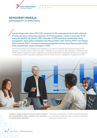 128DEMOGRAFI PEKERJADEMOGRAPHY OF EMPLOYEES Di bawah ini disajikan jumlah dan komposisi pekerja berdasarkan level organisasi/jabatan, tingkat pendidikan, status kepegawaian, usia, dan gender atau jenis kelamin.The number and composition of workers are specified below based on organizational level/position, level of education, employment status, age, and gender or sex. Sampai dengan akhir tahun 2023, PHE mengelola 14.154 orang pekerja, bertambah sebanyak 17 orang dari tahun sebelumnya sebanyak 14.137 orang pekerja. Jumlah ini terdiri dari 12.257 orang atau 86,60% laki-laki dan 1.897 orang atau 13,40% perempuan. Berdasarkan status kepegawaian, status pekerja dibedakan atas Pekerja Waktu Tidak Tertentu (PWTT) dan Pekerja Waktu Tertentu (PWT), termasuk di dalamnya pengelolaan Sumber Daya Manusia pada Entitas Anak yang dilakukan secara terintegrasi di PHE.Until the end of 2023, PHE manages 14,154 employees, an increase of 17 people from the previous year's 14,137 employees. This total consist of 12,257 individuals, or 86.60%, who are male, and 1,897 individuals, or 13.40%, who are female. Based on employment status, employees are classified as Permanent Employees and Fixed-Term Employees, including those of PHE's subsidiaries employees which its Human Resource management is integrated into PHE.Laporan Tahunan %u2022 PT Pertamina Hulu EnergiPROFIL PERUSAHAANCOMPANY PROFILE 3 4 5 6 7