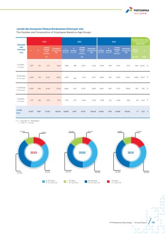 Jumlah dan Komposisi Pekerja Berdasarkan Kelompok UsiaThe Number and Composition of Employees Based on Age GroupsKelompok UsiaKelompok Usia2023 2022 2021Kenaikan (Penurunan) Increase (Decrease)2022-2023L PJumlah(orang)Total(Person)KomposisiComposition(%)L(orang)(Person)P(orang)(Person)Jumlah(orang)Total(Person)KomposisiComposition(%)L(orang)(Person)P(orang)(Person)Jumlah(orang)Total(Person)KomposisiComposition(%)OrangPerson %(1) (2) (3=1-2) (3/2)%u2265 51 tahun%u2265 51 years 1.927 190 2.117 14,96 1.839 188 2.027 14,34 2.293 248 2.541 17,10 (64) (4,44) %uf0e241-50 tahun41-50 years 4.819 591 5.410 38,22 4.591 522 5.113 36,17 4.681 524 5.205 35,04 (306) (5,51) %uf0e231-40 tahun31-40 years 4.394 854 5.248 37,08 4.680 874 5.554 39,29 4.801 900 5.701 38,38 297 5,81 %uf0e2%u2264 30 tahun%u2264 30 years 1.117 262 1.379 9,74 1.170 273 1.443 10,21 1.168 241 1.409 9,48 90 4,44 %uf0e1JumlahTotal 12.257 1.897 14.154 100,00 12.280 1.857 14.137 100,00 12.943 1.913 14.856 100,00 17 0,12 %uf0e1*) L = Laki-laki | P = PerempuanL = Male | P = Female41-50 Tahun41-50 Years Old< 30 Tahun< 30 Years Old30-40 tahun30-40 Years Old> 51 tahun> 51 Years Old14,96%38,22% 37,08%9,74%2023 202210,21%39,29% 36,17%14,34%202117,10%38,38% 35,04%9,48%PT Pertamina Hulu Energi %u2022 Annual Report 131