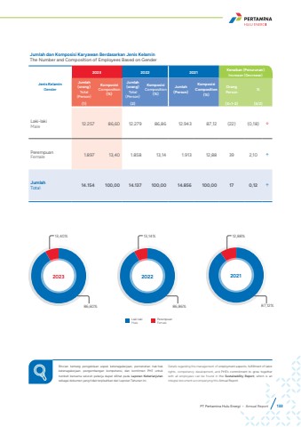Jumlah dan Komposisi Karyawan Berdasarkan Jenis KelaminThe Number and Composition of Employees Based on GenderJenis KelaminGender2023 2022 2021 Kenaikan (Penurunan)Increase (Decrease)Jumlah(orang)Total(Person)KomposisiComposition(%)Jumlah(orang)Total(Person)KomposisiComposition(%)Jumlah(Person)KomposisiComposition(%)OrangPerson %(1) (2) (3=1-2) (3/2)Laki-lakiMale 12.257 86,60 12.279 86,86 12.943 87,12 (22) (0,18) %uf0e2PerempuanFemale 1.897 13,40 1.858 13,14 1.913 12,88 39 2,10 %uf0e1JumlahTotal 14.154 100,00 14.137 100,00 14.856 100,00 17 0,12 %uf0e1Laki-lakiMalePerempuanFemale12,88%87,12%202113,14%86,86%202213,40%86,60%2023Rincian tentang pengelolaan aspek ketenagakerjaan, pemenuhan hak-hak ketenagakerjaan, pengembangan kompetensi, dan komitmen PHE untuk tumbuh bersama seluruh pekerja dapat dilihat pada Laporan Keberlanjutansebagai dokumen yang tidak terpisahkan dari Laporan Tahunan ini.Details regarding the management of employment aspects, fulfillment of labor rights, competency development, and PHE's commitment to grow together with all employees can be found in the Sustainability Report, which is an integral document accompanying this Annual Report.PT Pertamina Hulu Energi %u2022 Annual Report 133