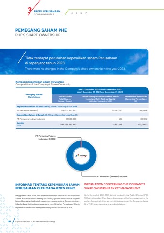 134PEMEGANG SAHAM PHEPHE%u2019S SHARE OWNERSHIPTidak terdapat perubahan kepemilikan saham Perusahaan di sepanjang tahun 2023.There were no changes in the Company%u2019s share ownership in the year 2023.Pemegang SahamShareholdersPer 31 Desember 2022 dan 31 Desember 2023As of December 31, 2022 and December 31, 2023Jumlah SahamTotal Shares (Lembar / Sheets)Modal Ditempatkan dan Disetor PenuhIssued and Fully Paid-up Capital (AS$-ribu / thousands of USD)Persentase Kepemilikan Ownership Percentage (%)Kepemilikan Saham 5% atau Lebih / Share Ownership 5% or MorePT Pertamina (Persero) 396.212.442.340 13.630.780 99,9968 Kepemilikan Saham di Bawah 5% / Share Ownership Less than 5%PT Pertamina Pedeve Indonesia 12.800.000 686 0,0032JumlahTotal 396.225.242.340 13.631.466 100,0000Komposisi Kepemilikan Saham PerusahaanComposition of the Company%u2019s Share Ownership PT Pertamina (Persero): 99,9968PT Pertamina Pedeve Indonesia: 0,0032INFORMASI TENTANG KEPEMILIKAN SAHAM PERUSAHAAN OLEH MANAJEMEN KUNCIHingga akhir tahun 2023, PHE tidak melaksanakan Penawaran Umum Perdana Saham atau Initial Public Offering (IPO). PHE juga tidak melaksanakan program kepemilikan saham baik untuk manajemen maupun pekerja. Dengan demikian, tidak terdapat individu/perorangan yang memiliki saham Perusahaan. Seluruh kepemilikan saham PHE disampaikan sebagaimana tercantum di atas.INFORMATION CONCERNING THE COMPANY%u2019S SHARE OWNERSHIP BY KEY MANAGEMENT Up to the end of 2023, PHE did not conduct Initial Public Offering (IPO). PHE did not conduct Share Ownership program, either for management or for workers. Accordingly, there are no individuals who own the Company%u2019s shares. All of PHE%u2019s share ownership is as indicated above Laporan Tahunan %u2022 PT Pertamina Hulu EnergiPROFIL PERUSAHAANCOMPANY PROFILE 3 4 5 6 7
