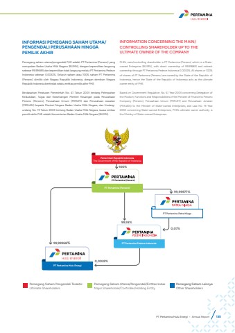 0,0032%99,99977%99,93%100%PT Pertamina Patra NiagaPT Pertamina Pedeve IndonesiaPT Pertamina Hulu EnergiPemerintah Republik IndonesiaThe Government of the Republic of IndonesiaPT Pertamina (Persero)PT Pertamina (Persero)99,99968%0,07%INFORMASI PEMEGANG SAHAM UTAMA/PENGENDALI PERUSAHAAN HINGGA PEMILIK AKHIRPemegang saham utama/pengendali PHE adalah PT Pertamina (Persero) yang merupakan Badan Usaha Milik Negara (BUMN), dengan kepemilikan langsung sebesar 99,9968% dan kepemilikan tidak langsung melalui PT Pertamina Pedeve Indonesia sebesar 0,0032%. Seluruh saham atau 100% saham PT Pertamina (Persero) dimiliki oleh Negara Republik Indonesia, dengan demikian Negara Republik Indonesia bertindak selaku entitas pemilik akhir PHE.Berdasarkan Peraturan Pemerintah No. 41 Tahun 2003 tentang Pelimpahan Kedudukan, Tugas dan Kewenangan Menteri Keuangan pada Perusahaan Persero (Persero), Perusahaan Umum (PERUM) dan Perusahaan Jawatan (PERJAN) kepada Menteri Negara Badan Usaha Milik Negara, dan Undangundang No. 19 Tahun 2003 tentang Badan Usaha Milik Negara; kuasa entitas pemilik akhir PHE adalah Kementerian Badan Usaha Milik Negara (BUMN).INFORMATION CONCERNING THE MAIN/CONTROLLING SHAREHOLDER UP TO THE ULTIMATE OWNER OF THE COMPANYPHE%u2019s main/controlling shareholder is PT Pertamina (Persero) which is a Stateowned Enterprise (BUMN), with direct ownership of 99.9968% and indirect ownership through PT Pertamina Pedeve Indonesia 0.0032%. All shares or 100% of shares of PT Pertamina (Persero) are owned by the State of the Republic of Indonesia, hence the State of the Republic of Indonesia acts as the ultimate owner entity of PHE.Based on Government Regulation No. 41 Year 2003 concerning Delegation of the Position, Functions and Responsibilities of the Minister of Finance to Persero Company (Persero), Perusahaan Umum (PERUM) and Perusahaan Jonatan (PERJAN) to the Minister of State-owned Enterprises, and Law No. 19 Year 2003 concerning State-owned Enterprises; PHE%u2019s ultimate owner authority is the Ministry of State-owned Enterprises. Pemegang Saham Pengendali TerakhirUltimate ShareholdersPemegang Saham Utama/Pengendali/Entitas IndukMajor Shareholder/Controller/Holding EntityPemegang Saham LainnyaOther ShareholdersPT Pertamina Hulu Energi %u2022 Annual Report 135
