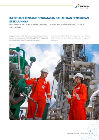 INFORMASI TENTANG PENCATATAN SAHAM DAN PENERBITAN EFEK LAINNYAINFORMATION CONCERNING LISTING OF SHARES AND EMITTING OTHER SECURITIES Hingga akhir tahun 2023, PHE tidak melakukan Penawaran Umum Perdana Saham atau Initial Public Offering (IPO). PHE juga tidak menerbitkan Surat Utang Efek dalam bentuk apapun.Until the end of 2023, PHE did not conduct Initial Public Offering (IPO). PHE did not issue Debenture Securities in any form whatsoever.PT Pertamina Hulu Energi %u2022 Annual Report 137
