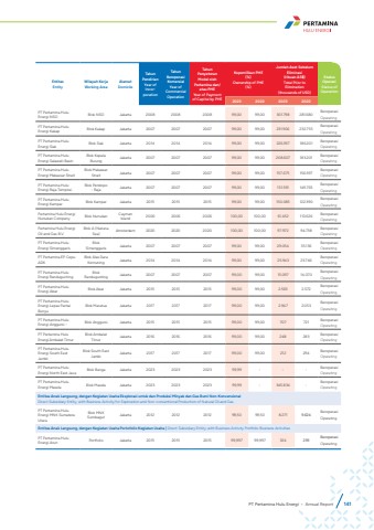 EntitasEntityWilayah KerjaWorking Area AlamatDomicileTahun PendirianYear of IncorporationTahun Beroperasi KomersialYear of Commercial Operation Tahun Penyetoran Modal oleh Pertamina dan/atau PHEYear of Payment of Capital by PHEKepemilikan PHE(%)Ownership of PHE(%)Jumlah Aset Sebelum Eliminasi(ribuan AS$)Total Prior to Elimination (thousands of USD)Status OperasiStatus of Operation2023 2022 2023 2022PT Pertamina Hulu Energi NSO Blok NSO Jakarta 2008 2008 2008 99,00 99,00 301.798 281.680 BeroperasiOperatingPT Pertamina Hulu Energi Kakap Blok Kakap Jakarta 2007 2007 2007 99,00 99,00 231.906 232.755 BeroperasiOperatingPT Pertamina Hulu Energi Siak Blok Siak Jakarta 2014 2014 2014 99,00 99,00 226.937 186.201 BeroperasiOperatingPT Pertamina Hulu Energi Salawati BasinBlok Kepala Burung Jakarta 2007 2007 2007 99,00 99,00 208.607 183.201 BeroperasiOperatingPT Pertamina Hulu Energi Makassar StraitBlok Makassar Strait Jakarta 2007 2007 2007 99,00 99,00 157.675 156.937 BeroperasiOperatingPT Pertamina Hulu Energi Raja TempiraiBlok Pendopo - Raja Jakarta 2007 2007 2007 99,00 99,00 151.591 149.763 BeroperasiOperatingPT Pertamina Hulu Energi Kampar Blok Kampar Jakarta 2015 2015 2015 99,00 99,00 150.085 122.390 BeroperasiOperatingPertamina Hulu Energi Nunukan Company Blok Nunukan Cayman Island 2006 2006 2006 100,00 100,00 61.452 110.626 BeroperasiOperatingPertamina Hulu Energi Oil and Gas B.VBlok A (Natuna Sea) Amsterdam 2020 2020 2020 100,00 100,00 97.972 94.738 BeroperasiOperatingPT Pertamina Hulu Energi SimenggarisBlok Simenggaris Jakarta 2007 2007 2007 99,00 99,00 29.054 35.136 BeroperasiOperatingPT Pertamina EP Cepu ADKBlok Alas Dara Kemuning Jakarta 2014 2014 2014 99,00 99,00 25.943 23.746 BeroperasiOperatingPT Pertamina Hulu Energi RanduguntingBlok Randugunting Jakarta 2007 2007 2007 99,00 99,00 15.097 14.070 BeroperasiOperatingPT Pertamina Hulu Energi Abar Blok Abar Jakarta 2015 2015 2015 99,00 99,00 2.563 2.572 BeroperasiOperatingPT Pertamina Hulu Energi Lepas Pantai BunyuBlok Maratua Jakarta 2017 2017 2017 99,00 99,00 2.947 2.053 BeroperasiOperatingPT Pertamina Hulu Energi Anggursi - Blok Anggursi Jakarta 2015 2015 2015 99,00 99,00 707 721 BeroperasiOperatingPT Pertamina Hulu Energi Ambalat TimurBlok Ambalat Timur Jakarta 2016 2016 2016 99,00 99,00 248 283 BeroperasiOperatingPT Pertamina Hulu Energi South East JambiBlok South East Jambi Jakarta 2017 2017 2017 99,00 99,00 212 294 BeroperasiOperatingPT Pertamina Hulu Energi North East Java Blok Bunga Jakarta 2023 2023 2023 99,99 - - - BeroperasiOperatingPT Pertamina Hulu Energi Masela Blok Masela Jakarta 2023 2023 2023 99,99 - 345.834 - BeroperasiOperatingEntitas Anak Langsung, dengan Kegiatan Usaha Eksplorasi untuk dan Produksi Minyak dan Gas Bumi Non-Konvensional Direct Subsidiary Entity, with Business Activity for Exploration and Non-conventional Production of Natural Oil and Gas PT Pertamina Hulu Energi MNK Sumatera UtaraBlok MNK Sumbagut Jakarta 2012 2012 2012 99,50 99,50 8.271 9.624 BeroperasiOperatingEntitas Anak Langsung, dengan Kegiatan Usaha Portofolio Kegiatan Usaha | Direct Subsidiary Entity, with Business Activity Portfolio Business ActivitiesPT Pertamina Hulu Energi Arun Portfolio Jakarta 2015 2015 2015 99,997 99,997 324 239 BeroperasiOperatingPT Pertamina Hulu Energi %u2022 Annual Report 141