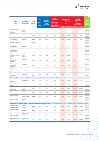 EntitasEntityWilayah KerjaWorking Area AlamatDomicileTahun PendirianYear of IncorporationTahun Beroperasi KomersialYear of Commercial Operation Tahun Penyetoran Modal oleh Pertamina dan/atau PHEYear of Payment of Capital by PHEKepemilikan PHE(%)Ownership of PHE(%)Jumlah Aset Sebelum Eliminasi(ribuan AS$)Total Prior to Elimination (thousands of USD)Status OperasiStatus of Operation2023 2022 2023 2022PT Pertamina Hulu Energi Metana Sumatera 6Blok Air Benakat II Jakarta 2012 2012 2012 99,50 99,50 148 147 BeroperasiOperatingPT Pertamina East NatunaBlok East Natuna Jakarta 2012 2012 2012 99,90 99,90 884 129 BeroperasiOperatingP E&P Libya Ltd Blok Libya Jakarta 2005 2005 2005 100,00 100,00 154 154 BeroperasiOperatingPertamina Hulu Energi Bukat Ltd Blok Bukat Cayman Island 1992 1992 1992 100,00 100,00 - - BeroperasiOperatingPT Pertamina Hulu Energi Babar SelaruBlok Babar Selaru Jakarta 2013 2013 2013 99,50 99,50 26 42 BeroperasiOperatingPT Pertamina Hulu Energi Semai II Blok Semai II Jakarta 2010 2010 2010 99,00 99,00 39 39 BeroperasiOperatingPT Pertamina Hulu Energi West Glagah KambunaBlok West Glagah KambunaJakarta 2009 2009 2009 99,00 99,00 - - BeroperasiOperatingPT Pertamina Hulu Energi Metana Sumatera 2Blok Muara Enim Jakarta 2009 2009 2009 99,00 99,00 18 18 BeroperasiOperatingPT Pertamina Hulu Energi Metana Sumatera 5Blok Muara Enim II Jakarta 2010 2010 2010 99,90 99,90 18 17 BeroperasiOperatingPT Pertamina Hulu Energi Metan Tanjung IVBlok Tanjung IV Jakarta 2010 2010 2010 99,90 99,90 97 97 BeroperasiOperatingPertamina Hulu Energi Ambalat Ltd. Blok Ambalat Cayman Island 1999 1999 1999 100,00 100,00 25 25 BeroperasiOperatingEntitas Anak Tidak Langsung, melalui PT Pertamina Hulu Indonesia | Indirect Subsidiary Entity, through PT Pertamina Hulu IndonesiaPT Pertamina Hulu Mahakam Blok Mahakam Jakarta 2015 2015 2015 99,93 99,93 2.582.072 2.821.273 BeroperasiOperatingPT Pertamina Hulu Attaka Blok Attaka Jakarta 2017 2017 2017 99,00 99,00 4.289 4.288 BeroperasiOperatingPT Pertamina Hulu Sanga SangaBlok Sanga Sanga Jakarta 2017 2017 2017 99,00 99,00 784.640 601.055 BeroperasiOperatingPT Pertamina Hulu Kalimantan TimurBlok East Kalimantan Jakarta 2018 2018 2018 99,00 99,00 685.083 621.485 BeroperasiOperatingPT Pertamina Hulu West Ganal Blok West Ganal Jakarta 2019 2019 2019 99,00 99,00 28.390 28.106 BeroperasiOperatingPT Pertamina Hulu BorneoBlok Peri Mahakam Jakarta 2023 2023 2023 99,00 99,00 123 - BeroperasiOperatingEntitas Anak Tidak Langsung, melalui PT Pertamina Internasional Eksplorasi dan Produksi | Indirect Subsidiary Entity, through PT Pertamina Internasional Eksplorasi dan ProduksiPT Pertamina Irak Eksplorasi ProduksiBlok West Qurna-1 Jakarta 2013 2013 2013 100,00 100,00 720.986 702.678 BeroperasiOperatingPT Pertamina Algeria Eksplorasi Produksi Blok 450a Jakarta 2014 2014 2014 100,00 100,00 1.139.447 1.177.466 BeroperasiOperatingPT Pertamina Malaysia Eksplorasi ProduksiSK 309, SK 311, SK314, Blok K, Blok HJakarta 2014 2014 2014 100,00 100,00 1.343.451 1.308.595 BeroperasiOperatingEtablissments Maurel et PromAmerika, Eropa, Afrika Paris 2017 2017 2017 71,09 71,09 2.166.167 1.987.893 BeroperasiOperatingPT Pertamina Hulu Energi %u2022 Annual Report 143