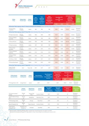 144EntitasEntityWilayah KerjaWorking Area AlamatDomicileTahun PendirianYear of IncorporationTahun Beroperasi KomersialYear of Commercial Operation Tahun Penyetoran Modal oleh Pertamina dan/atau PHEYear of Payment of Capital by PHEKepemilikan PHE(%)Ownership of PHE(%)Jumlah Aset Sebelum Eliminasi(ribuan AS$)Total Prior to Elimination (thousands of USD)Status OperasiStatus of Operation2023 2022 2023 2022Entitas Anak Tidak Langsung, melalui PT Pertamina Drilling Services Indonesia | Indirect Subsidiary Entity, through PT Pertamina Drilling Services IndonesiaPT Patra Drilling ContractorServices Company Jakarta 1981 1981 1981 99,96 99,96 110.021 82.922 BeroperasiOperatingEntitas Anak Tidak Langsung, melalui PT Elnusa Tbk | Indirect Subsidiary Entity, through PT Elnusa TbkPT Sigma Cipta Utama Services Company Jakarta 1980 1980 1980 99,99 99,99 24.132 20.040 BeroperasiOperatingPT Elnusa Fabrikasi KonstruksiServices Company Batam 1982 1982 1982 99,97 99,97 23.262 22.935 BeroperasiOperatingPT Elnusa Petrofin Services Company Jakarta 1996 1996 1996 99,99 99,99 238.309 217.204 BeroperasiOperatingPT Patra Nusa Data Services Company Jakarta 1987 1987 1987 99,50 99,50 9.227 8.930 BeroperasiOperatingPT Elnusa Trans Samudera Services Company Jakarta 2013 2013 2013 99,99 99,99 37.376 35.306 BeroperasiOperatingPT Elnusa Geosains IndonesiaServices Company Jakarta 2014 2014 2014 99,99 99,99 822 815 BeroperasiOperatingPT Elnusa Oilfield ServicesServices Company Jakarta 2014 2014 2014 99,99 99,99 3.063 2.847 BeroperasiOperatingKSO Elnusa - RAGA Services Company Jakarta 2017 2017 2017 100,00 100,00 4.428 4.512 BeroperasiOperatingPT Elnusa Daya Kreatif Services Company Jakarta 2015 2015 2015 99,99 99,99 647 641 BeroperasiOperatingEntitas Anak Tidak Langsung, melalui PT Badak NGL | Indirect Subsidiary Entity, through PT Badak NGLBadak Chiyoda Enerproco LLC LNG Texas, USA 2017 2017 2017 51,00 51,00 1.056 1.078 BeroperasiOperatingBidang UsahaBusiness Type Entitas AsosiasiAssociate EntityWilayah KerjaWorking Area AlamatDomicileTahun PendirianYear of Incor-porationTahun Beroperasi KomersialYear of Commercial Operation Tahun Penyetoran Modal oleh Pertamina dan/atau PHEYear of Payment of Capital by PHEKepemilikan PHE(%)Ownership of PHE(%)Status OperasiStatus of Operation2023 2022PT Donggi Senoro LNG Donggi Senoro Jakarta 2007 2007 2007 29,00 29,00 BeroperasiOperatingProduksiProductionWilayah KerjaWorking AreaDomisiliDomicileTahun Efektif KontrakYear of Contract Becoming Effective Tahun Mulai ProduksiYear of Starting ProductionPeriode Kontrak(tahun)Contract Period(Year)Status OperasiStatus of Operation PT Formasi Sumatera EnergyMinyakOilTanjung Tiga Timur Sumatera Selatan 2007 2007 25 BeroperasiOperatingGasindo Makmur Energy Ltd.MinyakOil Bangkudulis Kalimantan Timur 2007 2011 25 BeroperasiOperatingPT Petroenergy Utama MinyakOil Wiriagar Papua Barat 2009 2021 15 BeroperasiOperatingBass Oil Sukananti Ltd. MinyakOil Tangai Sukananti Sumatera Selatan 2010 2010 15 BeroperasiOperatingFoster Oil and Energy Pte. Ltd*)Minyak dan GasOil and Gas Jatinegara Jawa Barat 2011 2011 15 BeroperasiOperating*) Reposisi operator, sebelumnya PD Migas Bekasi menjadi Foster Oil and Energy Pte. Ltd. sejak 22 Juni 2023Reposition from the previous Operator PD Migas Bekasi to Foster Oil and Energy Pte. Ltd starting from June 22, 2023Laporan Tahunan %u2022 PT Pertamina Hulu EnergiPROFIL PERUSAHAANCOMPANY PROFILE 3 4 5 6 7