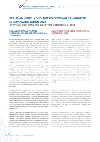 TINJAUAN UMUM: KONDISI PEREKONOMIAN DAN INDUSTRI DI SEPANJANG TAHUN 2023OVERVIEW: ECONOMIC AND INDUSTRIAL CONDITIONS IN 2023SEKILAS GAMBARAN TENTANG PEREKONOMIAN GLOBAL DAN NASIONAL TAHUN 2023Kondisi perekonomian dunia tahun 2023 dibayang-bayangi oleh isu resesi, khususnya terkait pemulihan atas pandemi COVID-19 yang terjadi sejak tahun 2020 dan dinyatakan telah menjadi endemi pada pertengahan tahun 2023. Berdasarkan data yang dirilis oleh International Monetary Fund (IMF) dalam dokumen World Economic Outlook (WEO), perekonomian global tahun 2023 diproyeksikan tumbuh hanya sebesar 3%, melambat dari tahun 2022 dengan pertumbuhan sebesar 3,5%. Berbagai gejolak mewarnai perekonomian dunia di sepanjang tahun 2023, seperti inflasi yang masih terus terjadi sejak tahun 2022 terutama akibat rentannya pasokan komoditas global pasca pandemi COVID-19, hingga krisis geopolitik baik di Rusia-Ukraina maupun Timur Tengah.IMF juga memperkirakan perekonomian negara-negara maju mengalami perlambatan dari 2,6% pada tahun 2022 menjadi 1,5% pada tahun 2023, di mana faktor inflasi memicu serangkaian pengetatan kebijakan moneter. Demikian pula perekonomian negara-negara berkembang diperkirakan mengalami stagnansi, dari 4,1% pada tahun 2022 menjadi 4% pada tahun 2023. Meskipun IMF mencatat adanya penurunan inflasi dunia, faktor inflasi masih menjadi tantangan serius yang berdampak terhadap perekonomian dunia dalam beberapa waktu ke depan. Inflasi global diperkirakan akan terus menurun, dari 8,7% pada tahun 2022 menjadi 6,9% pada tahun 2023.Menghadapi kondisi tersebut, Pemerintah Indonesia mengambil berbagai langkah antisipatif. Di samping berbagai kebijakan yang berupaya mendorong penguatan sektor industri dan pelaku UMKM, kunci penting dari respon Pemerintah Indonesia terlihat dari kebijakan inflasi nasional yang menunjukkan tren normalisasi dengan perlambatan inflasi terjadi lebih cepat dari perkiraan. Inflasi Indeks Harga Konsumen (IHK) pada Desember 2023 ditutup di level 2,61% dengan inflasi inti yang rendah pada level 1,80%, lebih rendah dibandingkan dengan inflasi IHK tahun 2022 yang tercatat sebesar 5,51%.Menurut data yang dipublikasikan Badan Pusat Statistik (BPS), perekonomian Indonesia di tahun 2023 mencatat pertumbuhan sebesar 5,05%, sedikit melambat dibandingkan tahun 2022 sebesar 5,31%. Meskipun mengalami perlambatan, perekonomian Indonesia mencatat pertumbuhan jauh di atas perekonomian dunia. Industri nasional secara keseluruhan mampu tumbuh dengan baik meskipun sebagian besar mengalami perlambatan dibandingkan tahun sebelumnya. Dari sisi produksi, pertumbuhan tertinggi terjadi A GLIMPSE OF THE GLOBAL AND NATIONAL ECONOMY IN 2023World economic conditions in 2023 were overshadowed by recession issues, especially related to the recovery from the COVID-19 pandemic that had occurred since 2020 and was declared as endemic in mid-2023. Based on data released by the International Monetary Fund (IMF) in the World Economic Outlook (WEO), the global economy in 2023 was projected to grow only by 3%, slowing from 2022 with growth of 3.5%. Various turmoil colored the world economy in 2023, such as inflation that continued to occur since 2022, especially due to the vulnerability of global commodity supply after the COVID-19 pandemic, to geopolitical crises both in Russia-Ukraine and the Middle East.The IMF also expected advanced economies to slow from 2.6% in 2022 to 1.5% in 2023, with inflation triggering a series of monetary policy tightening. Similarly, the economies of developing countries were expected to stagnate, from 4.1% in 2022 to 4% in 2023. Although the IMF recorded a decrease in world inflation rate, inflation factors remained a serious challenge bound to have an impact on the world economy in the near future. Global inflation was expected to continue to decline, from 8.7% in 2022 to 6.9% in 2023.Faced with these conditions, the Government of Indonesia took various anticipatory measures. In addition to various policies that seek to strengthen the industrial sector and MSME players, an important key to the Government of Indonesia%u2019s response is evident from the national inflation policy which shows a normalization trend with inflation slowing faster than expected. Consumer Price Index (CPI) inflation in December 2023 closed at 2.61% with low core inflation rate at 1.80%, lower than CPI inflation in 2022 which was recorded at 5.51%.According to data published by the Central Statistics Agency (BPS), Indonesia%u2019s economy in 2023 recorded growth of 5.05%, slowing slightly compared to 2022 of 5.31%. Despite the slowdown, Indonesia%u2019s economy recorded growth far above that of the world economy. The national industry as a whole was able to grow well although most of it experienced a slowdown compared to the previous year. In terms of production, the highest growth occurred in the Transportation and Warehousing business field by 13.96%, 152 Laporan Tahunan %u2022 PT Pertamina Hulu EnergiPEMBAHASAN DAN ANALISIS MANAJEMENMANAGEMENT DISCUSSION AND ANALYSIS 4 5 6 7