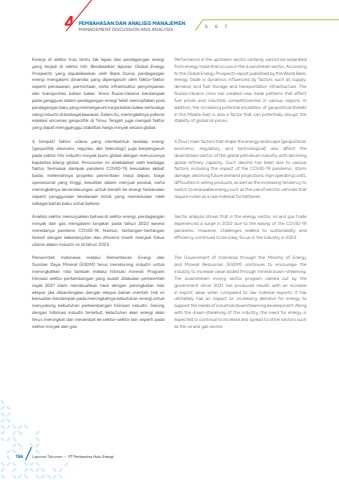 Kinerja di sektor hulu tentu tak lepas dari perdagangan energi yang terjadi di sektor hilir. Berdasarkan laporan Global Energy Prospects yang dipublikasikan oleh Bank Dunia, perdagangan energi mengalami dinamika yang dipengaruhi oleh faktor-faktor seperti penawaran, permintaan, serta infrastruktur penyimpanan dan transportasi bahan bakar. Krisis Rusia-Ukraina berdampak pada gangguan dalam perdagangan energi telah menciptakan pola perdagangan baru yang memengaruhi harga bahan bakar serta daya saing industri di berbagai kawasan. Selain itu, meningkatnya potensi eskalasi ancaman geopolitik di Timur Tengah juga menjadi faktor yang dapat mengganggu stabilitas harga minyak secara global.4 (empat) faktor utama yang membentuk lanskap energi (geopolitik, ekonomi, regulasi, dan teknologi) juga berpengaruh pada sektor hilir industri minyak bumi global dengan menurunnya kapasitas kilang global. Penurunan ini disebabkan oleh berbagai faktor, termasuk dampak pandemi COVID-19, kerusakan akibat badai, melemahnya proyeksi permintaan masa depan, biaya operasional yang tinggi, kesulitan dalam menjual produk, serta meningkatnya kecenderungan untuk beralih ke energi terbarukan seperti penggunaan kendaraan listrik yang memerlukan nikel sebagai bahan baku untuk baterai.Analisis sektor menunjukkan bahwa di sektor energi, perdagangan minyak dan gas mengalami lonjakan pada tahun 2022 karena meredanya pandemi COVID-19. Namun, tantangan-tantangan terkait dengan keberlanjutan dan efisiensi masih menjadi fokus utama dalam industri ini di tahun 2023.Pemerintah Indonesia melalui Kementerian Energi dan Sumber Daya Mineral (ESDM) terus mendorong industri untuk meningkatkan nilai tambah melalui hilirisasi mineral. Program hilirisasi sektor pertambangan yang sudah dilakukan pemerintah sejak 2021 silam membuahkan hasil dengan peningkatan nilai ekspor jika dibandingkan dengan ekspor bahan mentah. Hal ini kemudian berdampak pada meningkatnya kebutuhan energi untuk menyokong kebutuhan perkembangan hilirisasi industri. Seiring dengan hillirisasi industri tersebut, kebutuhan akan energi akan terus meningkat dan merambat ke sektor-sektor lain seperti pada sektor minyak dan gas.Performance in the upstream sector certainly cannot be separated from energy trade that occurs in the downstream sector. According to the Global Energy Prospects report published by the World Bank, energy trade is dynamics influenced by factors such as supply, demand, and fuel storage and transportation infrastructure. The Russia-Ukraine crisis has created new trade patterns that affect fuel prices and industrial competitiveness in various regions. In addition, the increasing potential escalation of geopolitical threats in the Middle East is also a factor that can potentially disrupt the stability of global oil prices.4 (four) main factors that shape the energy landscape (geopolitical, economic, regulatory, and technological) also affect the downstream sector of the global petroleum industry with declining global refinery capacity. Such decline has been due to various factors, including the impact of the COVID-19 pandemic, storm damage, declining future demand projections, high operating costs, difficulties in selling products, as well as the increasing tendency to switch to renewable energy such as the use of electric vehicles that require nickel as a raw material for batteries.Sector analysis shows that in the energy sector, oil and gas trade experienced a surge in 2022 due to the easing of the COVID-19 pandemic. However, challenges related to sustainability and efficiency continued to be a key focus in the industry in 2023.The Government of Indonesia through the Ministry of Energy and Mineral Resources (ESDM) continues to encourage the industry to increase value added through mineral down-streaming. The downstream mining sector program carried out by the government since 2021 has produced results with an increase in export value when compared to raw material exports. It has ultimately had an impact on increasing demand for energy to support the needs of industrial downstreaming development. Along with the down-streaming of the industry, the need for energy is expected to continue to increase and spread to other sectors such as the oil and gas sector.156 Laporan Tahunan %u2022 PT Pertamina Hulu EnergiPEMBAHASAN DAN ANALISIS MANAJEMENMANAGEMENT DISCUSSION AND ANALYSIS 4 5 6 7