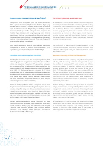 Eksplorasi dan Produksi Minyak & Gas (Migas)Sebagaimana telah disampaikan pada bab %u201cProfil Perusahaan%u201d dalam Laporan Tahunan ini, Eksplorasi dan Produksi Migas yang dilakukan PHE Subholding Upstream tersebar pada 43 Wilayah Kerja di Indonesia dan 25 Wilayah Kerja di berbagai wilayah internasional. Pada pendekatan kelompok usaha, Eksplorasi dan Produksi Migas dilakukan oleh yang tergabung dalam 5 (lima) regional, yaitu Regional 1 mencakup wilayah Sumatera, Regional 2 mencakup wilayah Jawa, Regional 3 mencakup wilayah Kalimantan, Regional 4 mencakup wilayah Indonesia Timur, dan Regional 5 yang mencakup wilayah internasional.Untuk dapat menjelaskan kegiatan yang dilakukan Perusahaan pada segmen ini, laporan ini membagi kegiatan ke dalam 2 (dua) bagian besar, yaitu Eksplorasi Migas, dan Produksi Migas.Konsultasi Bisnis dan Manajemen PortofolioPada kegiatan konsultasi bisnis dan manajemen portofolio, PHE Subholding Upstream mengelola dan mengembangkan portofolio entitas anak atau Anak Perusahaan (AP), perusahaan patungan, dan perusahaan afiliasi yang bergerak di dalam usaha hulu dan kegiatan usaha hilir, baik di dalam maupun luar negeri. Hingga akhir tahun 2023, PHE Subholding Upstream mengelola 68 AP. Bisnis yang dikerjakan oleh AP cukup beragam, sehingga membutuhkan bentuk portofolio yang terintegrasi. Adanya manajemen portofolio untuk setiap aset dengan melihat kekuatan masing-masing aset akan membantu pengambilan keputusan demi menjaga kesinambungan bisnis di masa mendatang.Penentuan strategi portofolio melalui serangkaian proses, mulai dari perencanaan keekonomian dan integrasi, manajemen ekonomi aset, dan risk profile setiap aset. Seluruh aset akan melalui proses evaluasi yang menyeluruh, baru setelahnya dapat ditentukan kategori aset dalam tiga skenario, yaitu low case, mid case, dan high case. Setiap skenario memiliki dampak yang berbeda, mulai dari low impact, mid impact, hingga high impact.Dengan mengimplementasikan model portofolio ini, PHE Subholding Upstream diharapkan dapat memetakan setiap aset, berikut penentuan strategi yang akan diterapkan, baik ditingkat Corporate Level Strategy, Business Level Strategy, ataupun Functional Level Strategy dalam mencapai pertumbuhan (Sustainable Competitive Advantage).Oil & Gas Exploration and ProductionAs stated in the %u201cCompany Profile%u201d chapter in this Annual Report, Oil and Gas Exploration and Production carried out by PHE Subholding Upstream has been spread across 43 Working Areas in Indonesia and 25 Working Areas in various international regions. In the business group approach, Oil and Gas Exploration and Production is carried out by members of 5 (five) regions, namely Regional 1 covering Sumatra, Regional 2 covering Java, Regional 3 covering Kalimantan, Regional 4 covering Eastern Indonesia, and Regional 5 covering international territory.For the purpose of elaborating on activities carried out by the Company in this segment, activities are classified into 2 (two) major categories in this report, namely Oil and Gas Exploration, and Oil and Gas Production.Business Consulting and Portfolio ManagementIn the context of business consulting and portfolio management activities, PHE Subholding Upstream manages and develops the portfolio of subsidiaries (AP), joint ventures, and affiliated companies engaging in upstream business and downstream business activities, both at home and overseas. By the end of 2023, PHE Subholding Upstream had been managing 68 APs. The business conducted by AP is quite diverse, so it requires an integrated portfolio format. Portfolio management for each asset taking into account the strength of each asset is expected to support decision making with the aim of maintaining business sustainability in the future.Portfolio strategy is determined through a series of processes, ranging from economic planning and integration, asset economic management, and risk profile of each asset. All assets go through a thorough evaluation process, then asset categories can be determined in three scenarios, namely low case, mid case, and high case. Each scenario has a different impact, ranging from low impact, mid impact, to high impact.By implementing such portfolio model, PHE Subholding Upstream is expected to map each asset, along with determining the strategy to be applied, at the Corporate Level Strategy, Business Level Strategy, or Functional Level Strategy levels in the context of achieving growth (Sustainable Competitive Advantage).164 Laporan Tahunan %u2022 PT Pertamina Hulu EnergiPEMBAHASAN DAN ANALISIS MANAJEMENMANAGEMENT DISCUSSION AND ANALYSIS 4 5 6 7