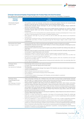 TantanganChallengesUraianDescriptionPertumbuhan OrganikOrganic Growth%u2022 Meningkatkan produksi dari lapangan existing serta mempercepat kegiatan eksplorasi dan pengembangan lapangan minyak dan gas baru di Indonesia melalui konsep integrated depletion plan.%u2022 Pengoperasian lapangan dengan kandungan CO2 dan H2S tinggi maupun lapangan dengan karakteristik tekanan dan temperatur tinggi. %u2022 Penerapan teknologi EOR pada lapangan mature secara selektif dengan penggunaan CO2 Injection, AlkalineSurfactant Polymer (ASP), dan lain-lain tentunya dengan melalui tahapan %u201dPilot Project%u201d supaya lebih komprehensif.%u2022 Increase production from existing fields and accelerate exploration activities and development of new oil and gas fields in Indonesia based on the concept of integrated depletion plan.%u2022 Field operations with high CO2 and H2S content as well as fields with high pressure and temperature characteristics.%u2022 The application of EOR technology in mature fields selectively with the use of CO2 Injection, Alkaline Surfactant Polymer (ASP), and others, of course, by going through the %u201cPilot Project%u201d stage in order to make it more comprehensive.Pertumbuhan Non OrganikNon-Organic Growth%u2022 Kondisi geopolotik tahun 2023 yang berdampak pada aktifitas investasi anorganik secara global.%u2022 Ketidakpastian dinamika industri migas seperti adanya isu transisi energi yang dapat mempengaruhi proses akuisisi dan pengelolaan pasca akuisisi.%u2022 Dinamika kondisi market khususnya proyek anorganik yang sifatnya kompetitif dan ketatnya tata waktu dari pihak Seller.%u2022 Beberapa proyek anorganik membutuhkan persetujuan dari otoritas pemerintah setempat yang berpotensi mempengaruhi Tingkat keberhasilan suatu transaksi. %u2022 Geopolitical conditions in 2023 that have an impact on global inorganic investment activities.%u2022 Uncertainties in the oil and gas industry dynamics, such as energy transition issues, that can affect the acquisition process and post-acquisition management.%u2022 The dynamics of market conditions, especially for inorganic projects, which are competitive and have tight timelines from the Seller%u2019s side.%u2022 Some inorganic projects require approval from local government authorities, which can potentially affect the success rate of a transaction.Tantangan Utama OperasionalKey Operational Challenges%u2022 Keseimbangan antara resources dan reserves movement. %u2022 Isu terkait mature asset dan aging surface facility asset. %u2022 Monetisasi gas. %u2022 Competitiveness yang berkaitan dengan fiscal regime, PSC flexibilities, dan aturan terkait dengan investasi. %u2022 Scaling Up IOR/Waterflood.%u2022 Balance between resources and reserves movement.%u2022 Issues related to mature assets and aging surface facility assets.%u2022 Gas monetization.%u2022 Competitiveness related to fiscal regime, PSC flexibility, and rules related to investment.%u2022 Scaling Up IOR/Waterflood.Tantangan Utama Pengembangan/Inovasi SistemKey Challenges of System Development/Innovation%u2022 Upaya penguasaan teknologi dan melakukan kerja sama dalam rancang bangun pengembangan lapangan gas kandungan CO2 tinggi bersama perusahaan yang mempunyai kemampuan, baik dari surface engineering maupun subsurface engineering (CO2 removal dan CO2 sequestration system).%u2022 Mengoptimalkan digitalisasi pada setiap proses bisnis Pertamina, baik proses utama maupun penunjang, antara lain dengan penerapan advanced analytics, robotics & automation, dan business model innovations.%u2022 Mendukung strategi Scaling Up EOR Tertiary melalui kemitraan. Pertamina membuka peluang untuk bekerja sama dengan mitra yang memiliki teknologi, pengalaman, dan komitmen yang tinggi untuk mengoptimisasi produksi dan meningkatkan Recovery Factor di Wilayah Kerja Pertamina yang mature, antara lain dengan penerapan performance based on contract.%u2022 Mempercepat penguasaan kemampuan teknologi dan digitalisasi, meliputi Eksplorasi dan Operasi Produksi di Lapangan Offshore dan Deep Water.%u2022 Endeavors to master technology and cooperate in the design of the development of high CO2 content gas fields with companies that possess the capacity, both in terms of surface engineering as well as subsurface engineering (CO2 removal and CO2 sequestration systems).%u2022 Optimizing digitalization in every Pertamina business process, both main as well as supporting processes, including the application of advanced analytics, robotics & automation, and business model innovations.%u2022 In support of Tertiary EOR Scaling Up strategy through partnerships. Pertamina opens up opportunities to work with partners who possess high technology, experience, and commitment to optimize production and improve Recovery Factor in Pertamina%u2019s mature Work Areas, among others by implementing performance based on contracts.%u2022 Accelerate the mastery of technology and digitalization capabilities, including Exploration and Production Operations in Offshore and Deep Water Fields.Tantangan Operasional Kegiatan Pengembangan dan Produksi Migas oleh Anak PerusahaanThe Operational Challenges of Oil And Gas Development and Production Activities by Subsidiary CompaniesPT Pertamina Hulu Energi %u2022 Annual Report 165