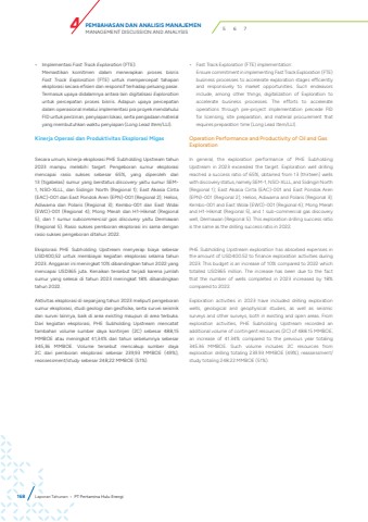 %u2022 Implementasi Fast Track Exploration (FTE):Memastikan komitmen dalam menerapkan proses bisnisFast Track Exploration (FTE) untuk mempercepat tahapaneksplorasi secara efisien dan responsif terhadap peluang pasar. Termasuk upaya didalamnya antara lain digitalisasi Explorationuntuk percepatan proses bisnis. Adapun upaya percepatandalam operasional melalui implementasi pra proyek mendahului FID untuk perizinan, penyiapan lokasi, serta pengadaan material yang membutuhkan waktu penyiapan (Long Lead Item/LLI).Kinerja Operasi dan Produktivitas Eksplorasi MigasSecara umum, kinerja eksplorasi PHE Subholding Upstream tahun 2023 mampu melebihi target. Pengeboran sumur eksplorasi mencapai rasio sukses sebesar 65%, yang diperoleh dari 13 (tigabelas) sumur yang berstatus discovery yaitu sumur SEM1, NSO-XLLL, dan Sidingin North (Regional 1); East Akasia Cinta (EAC)-001 dan East Pondok Aren (EPN)-001 (Regional 2); Helios, Adiwarna dan Polaris (Regional 3); Kembo-001 dan East Wolai (EWO)-001 (Regional 4); Mong Merah dan H1-Hikmat (Regional 5), dan 1 sumur subcommercial gas discovery yaitu Dermawan (Regional 5). Rasio sukses pemboran eksplorasi ini sama dengan rasio sukses pengeboran ditahun 2022.Eksplorasi PHE Subholding Upstream menyerap biaya sebesar USD400,52 untuk membiayai kegiatan eksplorasi selama tahun 2023. Anggaran ini meningkat 10% dibandingkan tahun 2022 yang mencapai USD365 juta. Kenaikan tersebut terjadi karena jumlah sumur yang selesai di tahun 2023 meningkat 18% dibandingkan tahun 2022.Aktivitas eksplorasi di sepanjang tahun 2023 meliputi pengeboran sumur eksplorasi, studi geologi dan geofisika, serta survei seismik dan survei lainnya, baik di area existing maupun di area terbuka. Dari kegiatan eksplorasi, PHE Subholding Upstream mencatat tambahan volume sumber daya kontinjen (2C) sebesar 488,15 MMBOE atau meningkat 41,34% dari tahun sebelumnya sebesar 345,36 MMBOE. Volume tersebut mencakup sumber daya 2C dari pemboran eksplorasi sebesar 239,93 MMBOE (49%), reassessment/study sebesar 248,22 MMBOE (51%).%u2022 Fast Track Exploration (FTE) implementation: Ensure commitment in implementing Fast Track Exploration (FTE) business processes to accelerate exploration stages efficientlyand responsively to market opportunities. Such endeavorsinclude, among other things, digitalization of Exploration toaccelerate business processes. The efforts to accelerateoperations through pre-project implementation precede FIDfor licensing, site preparation, and material procurement thatrequires preparation time (Long Lead Item/LLI).Operation Performance and Productivity of Oil and Gas ExplorationIn general, the exploration performance of PHE Subholding Upstream in 2023 exceeded the target. Exploration well drilling reached a success ratio of 65%, obtained from 13 (thirteen) wells with discovery status, namely SEM-1, NSO-XLLL, and Sidingin North (Regional 1); East Akasia Cinta (EAC)-001 and East Pondok Aren (EPN)-001 (Regional 2); Helios, Adiwarna and Polaris (Regional 3); Kembo-001 and East Wolai (EWO)-001 (Regional 4); Mong Merah and H1-Hikmat (Regional 5), and 1 sub-commercial gas discovery well, Dermawan (Regional 5). This exploration drilling success ratio is the same as the drilling success ratio in 2022.PHE Subholding Upstream exploration has absorbed expenses in the amount of USD400.52 to finance exploration activities during 2023. This budget is an increase of 10% compared to 2022 which totalled USD365 million. The increase has been due to the fact that the number of wells completed in 2023 increased by 18% compared to 2022.Exploration activities in 2023 have included drilling exploration wells, geological and geophysical studies, as well as seismic surveys and other surveys, both in existing and open areas. From exploration activities, PHE Subholding Upstream recorded an additional volume of contingent resources (2C) of 488.15 MMBOE, an increase of 41.34% compared to the previous year totaling 345.36 MMBOE. Such volume includes 2C resources from exploration drilling totaling 239.93 MMBOE (49%), reassessment/study totaling 248.22 MMBOE (51%).168 Laporan Tahunan %u2022 PT Pertamina Hulu EnergiPEMBAHASAN DAN ANALISIS MANAJEMENMANAGEMENT DISCUSSION AND ANALYSIS 4 5 6 7