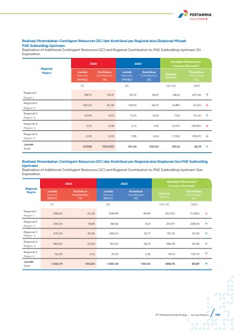 RegionalRegion2023 2022 Kenaikan (Penurunan)Increase (Decrease)JumlahAmount(MMBO)KontribusiContribution(%)JumlahAmount(MMBO)KontribusiContribution(%)Nominal(MMBO)PersentasePercentage(%)(1) (2) (3=1-2) (3/2)Regional 1Region 1 98,75 44,91 30,14 18,67 68,61 227,64 %uf0e1Regional 2Region 2 100,02 45,48 106,91 66,21 (6,89) (6,44) %uf0e2Regional 3Region 3 20,95 9,53 13,31 8,24 7,64 57,40 %uf0e1Regional 4Region 4 0,13 0,06 3,13 1,94 (3,00) (95,85) %uf0e2Regional 5Region 5 0,05 0,02 7,98 4,94 (7,93) (99,37) %uf0e2JumlahTotal 219,89 100,00% 161,46 100,00 58,43 36,19 %uf0e1Realisasi Penambahan Contingent Resources (2C) dan Kontribusi per Regional atas Eksplorasi Minyak PHE Subholding UpstreamRealization of Additional Contingent Resources (2C) and Regional Contribution to PHE Subholding Upstream Oil ExplorationRegionalRegion2023 2022 Kenaikan (Penurunan)Increase (Decrease)JumlahAmount(BSCF)KontribusiContribution(%)JumlahAmount(BSCF)KontribusiContribution(%)Nominal(BSCF)PersentasePercentage(%)(1) (2) (3=1-2) (3/2)Regional 1Region 1 348,45 22,42 408,99 38,39 (60,54) (14,80) %uf0e2Regional 2Region 2 290,53 18,69 88,56 8,31 201,97 228,06 %uf0e1Regional 3Region 3 470,29 30,26 348,53 32,71 121,76 34,94 %uf0e1Regional 4Region 4 380,62 24,49 194,23 18,23 186,39 95,96 %uf0e1Regional 5Region 5 64,29 4,14 25,14 2,36 39,15 155,73 %uf0e1JumlahTotal 1.554,19 100,00 1.065,45 100,00 488,74 45,87 %uf0e1 Realisasi Penambahan Contingent Resources (2C) dan Kontribusi per Regional atas Eksplorasi Gas PHE Subholding UpstreamRealization of Additional Contingent Resources (2C) and Regional Contribution to PHE Subholding Upstream Gas ExplorationPT Pertamina Hulu Energi %u2022 Annual Report 169