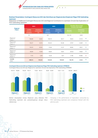 RegionalRegion2023 2022 Kenaikan (Penurunan)Increase (Decrease)JumlahAmount(MMBOE)KontribusiContribution(%)JumlahAmount(MMBOE)KontribusiContribution(%)Nominal(MMBOE)PersentasePercentage(%)(1) (2) (3=1-2) (3/2)Regional 1Region 1 158,89 32,55 100,73 29,17 58,16 57,74 %uf0e1Regional 2Region 2 150,17 30,76 122,20 35,38 27,97 22,89 %uf0e1Regional 3Region 3 102,12 20,92 73,46 21,27 28,66 39,01 %uf0e1Regional 4Region 4 65,83 13,48 36,65 10,61 29,18 79,60 %uf0e1Regional 5Region 5 11,14 2,28 12,32 3,57 (1,18) (9,58) %uf0e2JumlahTotal 488,15 100,00 345,36 100,00 142,78 41,34 %uf0e1Realisasi Penambahan Contingent Resources (2C) dan Kontribusi per Regional atas Eksplorasi Migas PHE Subholding UpstreamRealization of Additional Contingent Resources (2C) and Regional Contribution to Upstream Oil and Gas Exploration of PHE Subholding UpstreamContingent Resources (2C) per Regional atas Eksplorasi Migas PHE Subholding Upstream (MMBOE) Contingent Resources (2C) per Regional for Upstream Oil and Gas Exploration PHE Subholding (MMBOE) 100,73 158,89 122,20 150,17 73,46 102,12 36,65 65,83 12,32 11,14 345,36 488,1520222023Regional 1 Regional 2 Regional 3 Regional 4 Regional 5 2CBerikut disampaikan kinerja Eksplorasi yang dilakukan PHE Subholding Upstream dan perbandingannya dengan tahun sebelumnya.Following is the performance of Exploration conducted by PHE Subholding Upstream and comparison thereof with the previous year.170 Laporan Tahunan %u2022 PT Pertamina Hulu EnergiPEMBAHASAN DAN ANALISIS MANAJEMENMANAGEMENT DISCUSSION AND ANALYSIS 4 5 6 7