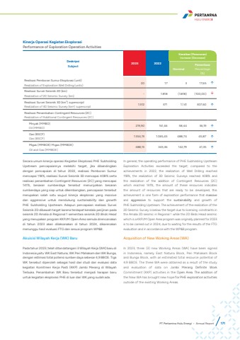DeskripsiSubject 2023 2022Kenaikan (Penurunan)Increase (Decrease)NominalPersentasePercentage(%)Realisasi Pemboran Sumur Eksplorasi (unit)Realization of Exploration Well Drilling (units) 20 17 3 17,65 %uf0e1Realisasi Survei Seismik 2D (km)Realization of 2D Seismic Survey (km) - 1.818 (1.818) (100,00) %uf0e2Realisasi Survei Seismik 3D (km2) superscriptRealization of 3D Seismic Survey (km2) superscript 1.512 371 1.141 307,60 %uf0e1Realisasi Penambahan Contingent Resources (2C)Realization of Additional Contingent Resources (2C)Minyak (MMBO) Oil (MMBO) 219,90 161,46 58,44 36,19 %uf0e1Gas (BSCF)Gas (BSCF) 1.554,19 1.065,45 488,74 45,87 %uf0e1Migas (MMBOE) Migas (MMBOE)Oil and Gas (MMBOE) 488,15 345,36 142,79 41,35 %uf0e1Kinerja Operasi Kegiatan Eksplorasi Performance of Exploration Operation Activities Secara umum kinerja operasi Kegiatan Eksplorasi PHE Subholding Upstream pencapaiannya melebihi target, jika dibandingkan dengan pencapaian di tahun 2022, realisasi Pemboran Sumur mencapai 118%, realisasi Survei Seismik 3D mencapai 408% serta realisasi penambahan Contingent Resources (2C) yang mencapai 141%, besaran sumberdaya tersebut menunjukkan besaran sumberdaya yang siap untuk dikembangkan, pencapaian tersebut merupakan salah satu wujud kinerja eksplorasi yang massivedan aggressive untuk mendukung sustainability dan growthPHE Subholding Upstream. Adapun pencapaian realisasi Survei Seismik 2D dibawah target karena terdapat kendala perijinan pada seismik 2D Amalia di Regional 1 sementara seismik 2D Birds Headyang merupakan program KKPJM Open Area semula direncanakan di tahun 2023 akan dilaksanakan di tahun 2024, dikarenakan menunggu hasil evaluasi FTG dan sesuai program WP&B.Akuisisi Wilayah Kerja (WK) BaruPada tahun 2023, telah ditandatangani 3 Wilayah Kerja (WK) baru di Indonesia yaitu WK East Natuna, WK Peri Mahakam dan WK Bunga, dengan estimasi total potensi sumber daya sebesar 4,9 BBOE. Tiga WK tersebut diperoleh sebagai hasil dari studi dan evaluasi data kegiatan Komitmen Kerja Pasti (KKP) Jambi Merang di Wilayah Terbuka. Penambahan WK Baru tersebut menjadi harapan baru untuk kegiatan eksplorasi PHE di luar dari WK yang sudah ada.In general, the operating performance of PHE Subholding Upstream Exploration Activities exceeded the target; compared to the achievements in 2022, the realization of Well Drilling reached 118%, the realization of 3D Seismic Surveys reached 408% and the realization of the addition of Contingent Resources (2C) which reached 141%, the amount of these resources indicates the amount of resources that are ready to be developed, this achievement is one form of exploration performance that massiveand aggressive to support the sustainability and growth ofPHE Subholding Upstream. The achievement of the realization of the 2D Seismic Survey is below the target due to licensing constraints in the Amalia 2D seismic in Regional 1 while the 2D Birds Head seismic which is a KKPJM Open Area program was originally planned for 2023 is to be carried out in 2024, due to waiting for the results of the FTG evaluation and in accordance with the WP&B program.Acquisition of New Working Areas (WA)In 2023, three (3) new Working Areas (WA) have been signed in Indonesia, namely East Natuna Block, Peri Mahakam Block and Bunga Block, with an estimated total resource potential of 4.9 BBOE. The three WA were obtained as a result of the study and evaluation of data on Jambi Merang Definite Work Commitment (KKP) activities in the Open Area. The addition of the New WA has brought new hope for PHE exploration activities outside of the existing Working Areas. PT Pertamina Hulu Energi %u2022 Annual Report 171