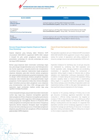 Rencana Pengembangan Kegiatan Eksplorasi Migas di Masa MendatangAspirasi eksplorasi yang tertuang dalam Pertamina RJPP Unconstraint 2024-2029 & supplement BUMN 2034 meliputi 4 (empat) hal yaitu jumlah pengeboran sumur eksplorasi, penambahan sumberdaya 2C, rata-rata sumberdaya per sumur dan biaya CAPEX eksplorasi. Bentuk upaya eksplorasi dalam menemukan sumberdaya migas baru yaitu dengan mengkombinasikan sumur near field explorationdan frontier exploration, mengelola baseline dan mengakselerasi monetisasi temuan eksplorasi. Implementasi target pengeboran eksplorasi didasarkan pada data historikal realisasi pengeboran dan upaya perbaikan berkelanjutan yang telah direalisasikan. Selain itu dengan melihat kemampuan eksekusi pengeboran eksplorasi berdasarkan data historikal dalam mengimplementasikan target pengeboran. Frontier exploration melalui New Venture diharapkan dapat memainkan perannya dalam pengeboran sumur eksplorasi yang terimplementasi mulai tahun 2030 sehingga green field exploration dapat memberikan implikasi sumber daya yang signifikan terhadap Perusahaan.Untuk menjawab tantangan yang semakin besar dalam menemukan sumber daya migas baru, eksplorasi meningkatkan agresivitas dalam pengeboran offshore. Eksplorasi menargetkan pertumbuhan temuan sumberdaya 14% hingga tahun 2034 sebagai upaya untuk memperpanjang dan meningkatkan Reserve to Production (RTP) melalui pengeboran di existing block dan new venture. Harapannya Agresivitas aktivitas eksplorasi diharapkan dapat meningkatkan temuan rata-rata sumberdaya per sumur. Di karenakan pengeboran eksplorasi yang didominasi oleh pengeboran offshore berdampak pada kenaikan CAPEX eksplorasi.Future Oil and Gas Exploration Activities Development PlanThe exploration aspirations set out in Pertamina RJPP Unconstraint 2024-2029 & BUMN 2034 supplement include 4 (four) aspects, namely the number of explorations well drilling, additional 2C resources, average resources per well and exploration CAPEX costs. Exploration endeavors for identifying new oil and gas resources are materialized by combining near field exploration and frontier exploration wells, managing baselines and accelerating monetization of exploration findings. The achievement of exploration drilling targets is based on historical data on drilling realization and implemented continuous improvement efforts. In addition, it includes taking into account the exploration drilling execution capability based on historical data in implementing drilling targets. It is expected that frontier exploration through New Venture will play a role in the drilling of exploration wells to be implemented starting in 2030 so that green field exploration can have significant resource implications for the Company. In response to the growing challenge of finding new oil and gas resources, increasingly aggressive exploration has been conducted in offshore drilling. Exploration has targeted an increase of 14% in resource discovery up to 2034 as an effort to extend and increase Reserve to Production (RTP) through drilling in existing blocks and new ventures. It is expected that exploration activities will be increasingly aggressive in order to increase the average per well finding of resources. It is because exploration drilling dominated by offshore drilling has an impact on the increase in exploration CAPEX.BLOCK AWARD STATUSEast NatunaOffshore Natuna(2.3 BBOE)*Contract signing on 30 May 2023, Pertamina PI 100%Firm Commitment (3 years) : Study G&G, 1 3D Seismic Survey & 1 WellPeri Mahakam(1.3 BBOE)*Offshore & Onshore East KalimantanContract signing on 30 May 2023, Pertamina PI 51% & Partner ENI PI 49%Firm Commitment (3 years) : Study G&G, 1 3D Seismic Survey & 1 WellBunga(1.3 BBOE)*Offshore East JavaContract signing on 26 July 2023, Pertamina PI 50% & Partner POSCO PI 50%Firm Commitment (3 years) : 1 Study G&G & 1 Seismic Survey 172 Laporan Tahunan %u2022 PT Pertamina Hulu EnergiPEMBAHASAN DAN ANALISIS MANAJEMENMANAGEMENT DISCUSSION AND ANALYSIS 4 5 6 7