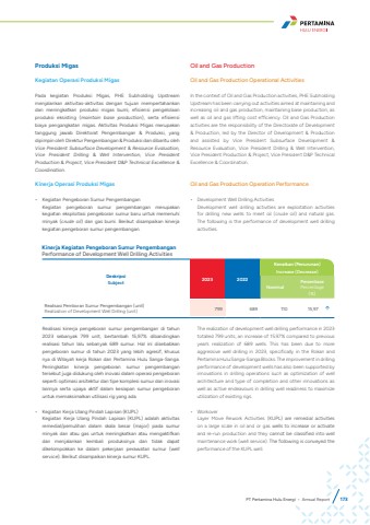 Produksi MigasKegiatan Operasi Produksi MigasPada kegiatan Produksi Migas, PHE Subholding Upstream menjalankan aktivitas-aktivitas dengan tujuan mempertahankan dan meningkatkan produksi migas bumi, efisiensi pengelolaan produksi eksisting (maintain base production), serta efisiensi biaya pengangkatan migas. Aktivitas Produksi Migas merupakan tanggung jawab Direktorat Pengembangan & Produksi, yang dipimpin oleh Direktur Pengembangan & Produksi dan dibantu oleh Vice President Subsurface Development & Resource Evaluation, Vice President Drilling & Well Intervention, Vice President Production & Project, Vice President D&P Technical Excellence & Coordination.Kinerja Operasi Produksi Migas%u2022 Kegiatan Pengeboran Sumur PengembanganKegiatan pengeboran sumur pengembangan merupakan kegiatan eksploitasi pengeboran sumur baru untuk memenuhi minyak (crude oil) dan gas bumi. Berikut disampaikan kinerja kegiatan pengeboran sumur pengembangan.Oil and Gas ProductionOil and Gas Production Operational ActivitiesIn the context of Oil and Gas Production activities, PHE Subholding Upstream has been carrying out activities aimed at maintaining and increasing oil and gas production, maintaining base production, as well as oil and gas lifting cost efficiency. Oil and Gas Production activities are the responsibility of the Directorate of Development & Production, led by the Director of Development & Production and assisted by Vice President Subsurface Development & Resource Evaluation, Vice President Drilling & Well Intervention, Vice President Production & Project, Vice President D&P Technical Excellence & Coordination.Oil and Gas Production Operation Performance%u2022 Development Well Drilling ActivitiesDevelopment well drilling activities are exploitation activities for drilling new wells to meet oil (crude oil) and natural gas. The following is the performance of development well drilling activities.Realisasi kinerja pengeboran sumur pengembangan di tahun 2023 sebanyak 799 unit, bertambah 15,97% dibandingkan realisasi tahun lalu sebanyak 689 sumur. Hal ini disebabkan pengeboran sumur di tahun 2023 yang lebih agresif, khusus nya di Wilayah kerja Rokan dan Pertamina Hulu Sanga-Sanga. Peningkatan kinerja pengeboran sumur pengembangan tersebut juga didukung oleh inovasi dalam operasi pengeboran seperti optimasi arsitektur dan tipe komplesi sumur dan inovasi lainnya serta upaya aktif dalam kesiapan sumur pengeboran untuk memaksimalkan utilisasi rig yang ada.%u2022 Kegiatan Kerja Ulang Pindah Lapisan (KUPL)Kegiatan Kerja Ulang Pindah Lapisan (KUPL) adalah aktivitas remedial/pemulihan dalam skala besar (major) pada sumur minyak dan atau gas untuk meningkatkan atau mengaktifkan dan menjalankan kembali produksinya dan tidak dapat dikelompokkan ke dalam pekerjaan perawatan sumur (well service). Berikut disampaikan kinerja sumur KUPL.The realization of development well drilling performance in 2023 totalled 799 units, an increase of 15.97% compared to previous year%u2019s realization of 689 wells. This has been due to more aggressive well drilling in 2023, specifically in the Rokan and Pertamina Hulu Sanga-Sanga Blocks. The improvement in drilling performance of development wells has also been supported by innovations in drilling operations such as optimization of well architecture and type of completion and other innovations as well as active endeavours in drilling well readiness to maximize utilization of existing rigs.%u2022 WorkoverLayer Move Rework Activities (KUPL) are remedial activities on a large scale in oil and or gas wells to increase or activate and re-run production and they cannot be classified into well maintenance work (well service). The following is conveyed the performance of the KUPL well.DeskripsiSubject 2023 2022Kenaikan (Penurunan)Increase (Decrease)NominalPersentasePercentage(%)Realisasi Pemboran Sumur Pengembangan (unit)Realization of Development Well Drilling (unit) 799 689 110 15,97 %uf0e1Kinerja Kegiatan Pengeboran Sumur PengembanganPerformance of Development Well Drilling ActivitiesPT Pertamina Hulu Energi %u2022 Annual Report 173