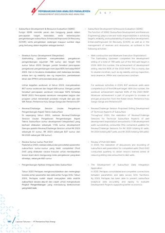 %u2022 Subsurface Development & Resource Evaluation (SDRE)Fungsi SDRE memiliki peran dan tanggung jawab dalampencapaian target, keandalan, serta keberlanjutanpengembangan subsurface, Enhanced/Improved Oil Recovery (E/IOR), serta pengelolaan cadangan maupun sumber dayayang tertuang dalam kegiatan sebagai berikut:%u2022 Eksekusi Sumur Development (Eksploitasi)Subholding Upstream menyelesaikan pengeboranpengembangan sejumlah 799 sumur dari target 943sumur tahun 2023. Dengan jumlah tersebut pencapaianpengeboran pengembangan mencapai 85% terhadap RKAP 2023. Hal ini terutama disebabkan oleh beberapa kendala,antara lain rig reability dan rig inspection, pembebasanlahan dan IPPKH serta kendala akses jalan.Untuk kegiatan workover di tahun 2023, menyelesaikan 837 sumur workover dari target 638 sumur. Dengan jumlah tersebut pencapaian workover mencapai 122% terhadap RKAP 2023. Pencapaian workover merupakan bagian dari program untuk menambah produksi minyak dan gas dari WK Rokan, Pertamina Hulu Sanga-Sanga dan Pertamina EP. %u2022 Review/Challange Session Usulan Pengeboran Pengembangan Aspek Teknis SubsurfaceDi sepanjang tahun 2023, realisasi Review/Challange Session Usulan Pengeboran Pengembangan Aspek Teknis Subsurface sumur development (eksploitasi) yang berhasil dilakukan sebanyak 1.106 sumur development(berupa update Review/Challenge Session untuk RK 2023 sebanyak 61 sumur, RK 2024 sebanyak 827 sumur dan RK 2025 sebanyak 128 sumur).%u2022 Review Sumur-sumur Post DrillPada tahun 2023, realisasi diskusi dan pencatatan parameter subsurface sumur-sumur yang telah completed (Post Drill) yang dilakukan secara triwulan untuk mendapatkanlesson learn demi mengurangi risiko pengeboran yang akan dihadapi, sebanyak 662 sumur.%u2022 Pengembangan Aplikasi Integrasi Data SubsurfaceTahun 2022 Pertapas mengkonsolidasikan dan melengkapi koneksi antar-parameter dan data antar-fungsi SHU. Tahun 2023, Pertapas sudah dapat menyajikan data analitik subsurface secara akurat dan cepat untuk mengevaluasi Project Pengembangan yang mendukung keekonomian yang lebih baik.%u2022 Subsurface Development & Resource Evaluation (SDRE)The function of SDRE (Subsurface Development and ReservoirEngineering) plays a role and holds responsibilities in achievingtargets, reliability, and sustainability of subsurface development, Enhanced/Improved Oil Recovery (E/IOR), as well as in themanagement of reserves and resources, as outlined in thefollowing activities:%u2022 Well construction and Workover Execution (Exploitation)The Subholding Upstream completed the developmentdrilling of a total of 799 wells out of the 943 well target in2023. With this number, the achievement of developmentdrilling reached 85% of the 2023 RKAP. This is mainly dueto several constrain, such as rig reability and rig inspection,land clearence, IPPKH and road access constrain.For workover activities in 2023, 837 workover wells were completed out of the 638 well target. With this number, the workover achievement reached 122% of the 2023 RKAP. Workover achievement is part of program to increase oil and gas production from the Rokan block, Pertamina Hulu Sanga-Sanga and Pertamina EP.%u2022 Review/Challenge Session Proposed Drilling Developmentof Technical Aspects of Subsurface Throughout 2023, the realization of Review/ChallengeSessions for Technical Subsurface Aspects of welldevelopment (exploitation) amounted to 1.106 development wells successfully conducted (this comprised updates forReview/Challenge Sessions for RK 2023 totaling 61 wells,RK 2024 totaling 827 wells, and RK 2025 totaling 128 wells).%u2022 Review of Post Drill Wells In 2023, the realization of discussions and recording ofsubsurface well parameters for completed wells (Post-Drill)conducted quarterly to obtain lessons learned aimed atreducing drilling risks amounted to 662 wells.%u2022 The Development of Subsurface Data IntegrationApplicationIn 2022, Pertapas consolidated and completed connections between parameters and data across SHU functions.By 2023, Pertapas has been able to present subsurfaceanalytical data accurately and rapidly to evaluateDevelopment Projects supporting better economics.180 Laporan Tahunan %u2022 PT Pertamina Hulu EnergiPEMBAHASAN DAN ANALISIS MANAJEMENMANAGEMENT DISCUSSION AND ANALYSIS 4 5 6 7