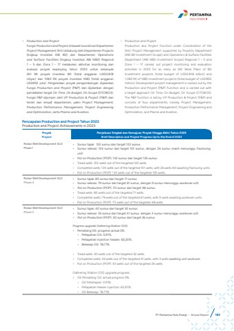 %u2022 Production and ProjectFungsi Production and Project di bawah koordinasi DepartemenProject Management SHU didukung oleh Departemen Projects (lingkup Investasi ABI BD) dan Departemen Operations and Surface Facilities (lingkup Investasi ABI NBD) Regional 1 %u2013 5 dan Zona 1 - 17 melakukan aktivitas monitoring dan evaluasi proyek sepanjang tahun 2023 untuk sebanyak 261 RK proyek Investasi BD (total anggaran USD2,818 milyar) dan 1083 RK proyek Investasi NBD (total anggaran USD952 juta). Pengelolaan proyek pengembangan dijalankan Fungsi Production and Project (P&P) dan dijalankan dengan pendekatan target On Time, On Budget, On Scope (OTOBOS). Fungsi P&P dipimpin oleh VP Production & Project (P&P) dan terdiri dari empat departemen, yakni Project Management, Production Performance Management, Project Engineering and Optimization, serta Marine and Aviation.%u2022 Production and ProjectProduction and Project Function under Coordination of the SHU Project Management supported by Projects Department (ABI BD Investment Scope) and Operations & Surface Facilities Department (ABI NBD Investment Scope) Regional 1 %u2013 5 and Zone 1 %u2013 17 carried out project monitoring and evaluation activities in 2023 for as many as 261 Work Plans of BD Investment projects (total budget of USD2.818 billion) and 1,083 RK of NBD Investment projects (total budget of USD952 million). Development project management is carried out by the Production and Project (P&P) Function and is carried out with a target approach On Time, On Budget, On Scope (OTOBOS). The P&P function is led by VP Production & Project (P&P) and consists of four departments, namely Project Management, Production Performance Management, Project Engineering and Optimization, and Marine and Aviation.ProyekProjectPenjelasan Singkat dan Kemajuan Proyek Hingga Akhir Tahun 2023Brief Description and Project Progress Up to the End of 2023Rokan Well Development SLO Phase 1%u2022 Sumur tajak: 122 sumur dari target 122 sumur.%u2022 Sumur selesai: 124 sumur dari target 101 sumur, dengan 26 sumur masih menunggu fracturing unit.%u2022 Put on Production (POP): 133 sumur dari target 135 sumur.%u2022 Tread wells: 122 wells out of the targeted 122 wells.%u2022 Completed wells: 124 wells out of the targeted 101 wells, with 26 wells still awaiting fracturing units.%u2022 Put on Production (POP): 133 wells out of the targeted 135 wells.Rokan Well Development SLO Phase 4%u2022 Sumur tajak: 85 sumur dari target 71 sumur.%u2022 Sumur selesai: 79 sumur dari target 61 sumur, dengan 9 sumur menunggu workover unit.%u2022 Put on Production (POP): 70 sumur dari target 48 sumur.%u2022 Tread wells: 85 wells out of the targeted 71 wells.%u2022 Completed wells: 79 wells out of the targeted 61 wells, with 9 wells awaiting workover units.%u2022 Put on Production (POP): 70 wells out of the targeted 48 wells.Rokan Well Development SLO Phase 2%u2022 Sumur tajak: 40 sumur dari target 32 sumur.%u2022 Sumur selesai: 33 sumur dari target 31 sumur, dengan 3 sumur menunggu workover unit.%u2022 Put on Production (POP): 30 sumur dari target 26 sumur.Progress upgrade Gathering Station (GS):%u2022 Pematang GS: progress actual 0%.%u2022 Petapahan GS: 0,91%.%u2022 Petapahan injection header: 62,20%.%u2022 Bekasap GS: 78,71%.%u2022 Tread wells: 40 wells out of the targeted 32 wells.%u2022 Completed wells: 33 wells out of the targeted 31 wells, with 3 wells awaiting unit workover.%u2022 Put on Production (POP): 30 wells out of the targeted 26 wells.Gathering Station (GS) upgrade progress:%u2022 GS Pematang GS: actual progress 0%.%u2022 GS Petahapan: 0.91%.%u2022 Petapahan header injection: 62.20%.%u2022 GS Bekasap: 78.71%.Pencapaian Production and Project Tahun 2023Production and Project Achievements in 2023PT Pertamina Hulu Energi %u2022 Annual Report 183
