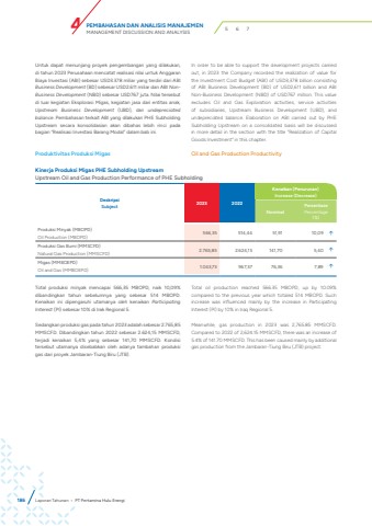 Untuk dapat menunjang proyek pengembangan yang dilakukan, di tahun 2023 Perusahaan mencatat realisasi nilai untuk Anggaran Biaya Investasi (ABI) sebesar USD3.378 miliar yang terdiri dari ABI Business Development (BD) sebesar USD2.611 miliar dan ABI NonBusiness Development (NBD) sebesar USD767 juta. Nilai tersebut di luar kegiatan Eksplorasi Migas, kegiatan jasa dari entitas anak, Upstream Business Development (UBD), dan undepreciated balance. Pembahasan terkait ABI yang dilakukan PHE Subholding Upstream secara konsolidasian akan dibahas lebih rinci pada bagian %u201cRealisasi Investasi Barang Modal%u201d dalam bab ini.Produktivitas Produksi MigasIn order to be able to support the development projects carried out, in 2023 the Company recorded the realization of value for the Investment Cost Budget (ABI) of USD3,378 billion consisting of ABI Business Development (BD) of USD2,611 billion and ABI Non-Business Development (NBD) of USD767 million. This value excludes Oil and Gas Exploration activities, service activities of subsidiaries, Upstream Business Development (UBD), and undepreciated balance. Elaboration on ABI carried out by PHE Subholding Upstream on a consolidated basis will be discussed in more detail in the section with the title %u201cRealization of Capital Goods Investment%u201d in this chapter.Oil and Gas Production ProductivityDeskripsiSubject 2023 2022Kenaikan (Penurunan)Increase (Decrease)NominalPersentasePercentage(%)Produksi Minyak (MBOPD) Oil Production (MBOPD) 566,35 514,44 51,91 10,09 %uf0e1Produksi Gas Bumi (MMSCFD)Natural Gas Production (MMSCFD) 2.765,85 2.624,15 141,70 5,40 %uf0e1Migas (MMBOEPD)Oil and Gas (MMBOEPD) 1.043,73 967,37 76,36 7,89 %uf0e1Kinerja Produksi Migas PHE Subholding UpstreamUpstream Oil and Gas Production Performance of PHE SubholdingTotal produksi minyak mencapai 566,35 MBOPD, naik 10,09% dibandingkan tahun sebelumnya yang sebesar 514 MBOPD. Kenaikan ini dipengaruhi utamanya oleh kenaikan Participating Interest (PI) sebesar 10% di Irak Regional 5.Sedangkan produksi gas pada tahun 2023 adalah sebesar 2.765,85 MMSCFD. Dibandingkan tahun 2022 sebesar 2.624,15 MMSCFD, terjadi kenaikan 5,4% yang sebesar 141,70 MMSCFD. Kondisi tersebut utamanya disebabkan oleh adanya tambahan produksi gas dari proyek Jambaran-Tiung Biru (JTB).Total oil production reached 566.35 MBOPD, up by 10.09% compared to the previous year which totaled 514 MBOPD. Such increase was influenced mainly by the increase in Participating Interest (PI) by 10% in Iraq Regional 5.Meanwhile, gas production in 2023 was 2,765.85 MMSCFD. Compared to 2022 of 2,624.15 MMSCFD, there was an increase of 5.4% of 141.70 MMSCFD. This has been caused mainly by additional gas production from the Jambaran-Tiung Biru (JTB) project.186 Laporan Tahunan %u2022 PT Pertamina Hulu EnergiPEMBAHASAN DAN ANALISIS MANAJEMENMANAGEMENT DISCUSSION AND ANALYSIS 4 5 6 7