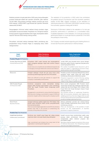 Realisasi produksi minyak pada tahun 2023 yang menyumbangkan produksi terbanyak adalah dari operator domestik, yakni sebesar 121.145 MBO. Penyumbang tertinggi realisasi produksi gas bumi 2023 sebesar 1.009,53 BSCF juga berasal dari operator domestik sebesar 667,22 BSCF.Pengungkapan informasi terkait realisasi kinerja produksi migas disampaikan secara konsolidasi. Penjelasan rinci mengenai realisasi kinerja produksi migas berdasarkan blok migas, disampaikan dalam Laporan Tahunan 2023 masing-masing entitas.Perusahaan mencatat adanya beberapa faktor pendukung dan penghambat kinerja Produksi Migas di sepanjang tahun 2023 sebagai berikut.The realization of oil production in 2023, which has contributed the greatest amount of production was from domestic operators totaled 121,145 MBO. Highest contributor of the realization of natural gas production in 2023 was 1,009.53 BSCF was also coming from domestic operators totaling 667.22 BSCF.Disclosure of information related to the realization of oil and gas production performance is submitted on a consolidated basis. A detailed explanation of the realization of oil and gas production performance based on oil and gas blocks is presented in the 2023 Annual Report of each entity.The Company recorded several supporting and inhibiting factors in Oil and Gas Production performance in 2023 as follows.AspekAspectFaktor PendukungSupporting FactorsFaktor PenghambatInhibiting FactorsProduksi Minyak/ Oil ProductionSumber Daya Manusia (SDM)Human Resources (HR)Kompetensi SDM sudah terampil dan berpengalaman dalam mengelola lapangan migas baik onshore maupun offshore.Human resource competencies are skilled and experienced in managing oil and gas fields both onshore and offshore.Jumlah SDM yang tersedia belum sesuai dengan kebutuhan dalam struktur organisasi (banyak posisi vacant yang belum terisi).The number of available human resources is yet to meet the needs in organizational structure (many vacant positions are yet to be filled).Resources Terdapat cadangan minyak dan gas yang cukup untuk mendukung keberlangsungan dan bisnis Perusahaan.There are sufficient oil and gas reserves to support the Company%u2019s sustainability and business.Peralatan produksi di beberapa Wilayah Kerja utama penghasil migas sudah usang dan tidak dapat mendukung secara penuh kebutuhan operasi.Production equipment in some of the key working areas producing oil and gas is outdated and is unable to fully support operational needs.ABO Produksi MinyakOil Production ABOKomitmen manajemen untuk memastikan strategi eksekusi ABO Produksi diprioritaskan untuk mendukung HSSE dan target Produksi tanpa mengurangi profitPerusahaan.Management%u2019s commitment to ensure that the Production ABO execution strategy is prioritized to support HSSE and production targets without reducing the company%u2019s profit.Bisnis proses pengawasan ABO Produksi masih menemukan kendala saat melakukan alignment dan validasi baik dari Zona-Region-SHU maupun lintas fungsi teknis dan fungsi keuangan maupun fungsi strategic planning.The business process of supervising Production ABO still encounters obstacles when aligning and validating both from the Zone-Region-SHU as well as across technical functions and financial functions as well as strategic planning functions.Bisnis ProsesBusiness ProcessTerdapat beberapa aplikasi digital dan STK (Sistem Tata Kelola) yang membantu dalam proses penyederhanaan bisnis proses produksi.There are several digital applications and STK (Governance System) that help in the process of streamlining the business of the production process.Adanya perbedaan prioritas dari masing-masing fungsi terhadap implementasi bisnis proses untuk mendukung produksi.There are discrepancies in the priorities of each function for the implementation of business processes to support production.Produksi Gas/ Gas ProductionInisiatif dan KomitmenInitiative and CommitmentKomitmen dan inisiatif yang tinggi dari setiap jenjang organisasi dalam mencapai target yang ditetapkan.High commitment and initiative from every level of the organization in achieving the targets set.Inisiatif rencana kerja membutuhkan waktu yang panjang dalam pembahasan teknis sehingga menghambat dalam eksekusi program dan pencapaian target.Work plan initiatives require a long time in the course of technical discussions, thus hampering program execution and target achievement.188 Laporan Tahunan %u2022 PT Pertamina Hulu EnergiPEMBAHASAN DAN ANALISIS MANAJEMENMANAGEMENT DISCUSSION AND ANALYSIS 4 5 6 7
