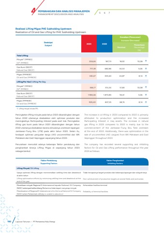 DeskripsiSubject 2023 2022Kenaikan (Penurunan)Increase (Decrease)NominalPersentasePercentage(%)Total LiftingMinyak* (MMBO)Oil* (MMBO) 206,65 187,73 18,92 10,08 %uf0e1Gas Bumi (BSCF)Natural Gas (BSCF) 717,39 682,86 34,53 5,06 %uf0e1Migas (MMBOE)Oil and Gas (MMBOE) 330,47 305,60 24,87 8,14 %uf0e1Lifting Per Hari/ Lifting Per DayMinyak* (MMBO)Oil* (MMBO) 566,17 514,34 51,83 10,08 %uf0e1Gas Bumi (BSCF)Natural Gas (BSCF) 1.965,46 1.870,85 94,61 5,06 %uf0e1Migas (MMBOE)Oil and Gas (MMBOE) 905,40 837,25 68,15 8,14 %uf0e1*) Lifting minyak include PPL.Realisasi Lifting Migas PHE Subholding UpstreamRealization of Oil and Gas Lifting for PHE Subholding UpstreamPeningkatan lifting minyak pada tahun 2023 dibandingkan dengan tahun 2022 utamanya disebabkan oleh optimasi produksi dan meningkatnya Participating Interest pada aset Irak. Peningkatan lifting gas bumi pada tahun 2023 dibandingkan dengan tahun 2022 utamanya disebabkan karena dimulainya onstream lapangan Jambaran-Tiung Biru (JTB) pada akhir tahun 2022. Selain itu, terdapat optimasi penjualan kargo LNG uncommitted dari WK Mahakam dan East Sepinggan sepanjang tahun 2023.Perusahaan mencatat adanya beberapa faktor pendukung dan penghambat kinerja Lifting Migas di sepanjang tahun 2023 sebagai berikut.The increase in oil lifting in 2023 compared to 2022 is primarily attributed to production optimization and the increased Participating Interest in Iraq assets. The increase in natural gas lifting in 2023 compared to 2022 is mainly due to the commencement of the Jambaran-Tiung Biru field onstream at the end of 2022. Additionally, there was optimization in the sale of uncommitted LNG cargoes from WK Mahakam and East Sepinggan throughout 2023.The company has recorded several supporting and inhibiting factors for Oil and Gas Lifting performance throughout the year 2023 as follows.Faktor PendukungSupporting FactorsFaktor PenghambatInhibiting FactorsLifting Minyak/ Oil LiftingUpaya optimasi lifting dengan meminimalkan settling time dan deadstock di akhir tahunLifting optimization efforts by minimizing settling time and deadstock at the end of the yearTidak tercapainya target produksi dari beberapa lapangan dan wilayah kerjaNon-achievement of production targets at several fields and work areasMonetisasi minyak Regional 5-Internasional kepada National Oil Company(NOC) setempat ketika kilang Pertamina tidak dapat menyerap minyakMonetization of Regional 5-International oil to the local National Oil Company (NOC) when Pertamina%u2019s refinery is unable to absorb oilKehandalan fasilitas terminalReliability of terminal facilities190 Laporan Tahunan %u2022 PT Pertamina Hulu EnergiPEMBAHASAN DAN ANALISIS MANAJEMENMANAGEMENT DISCUSSION AND ANALYSIS 4 5 6 7